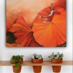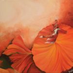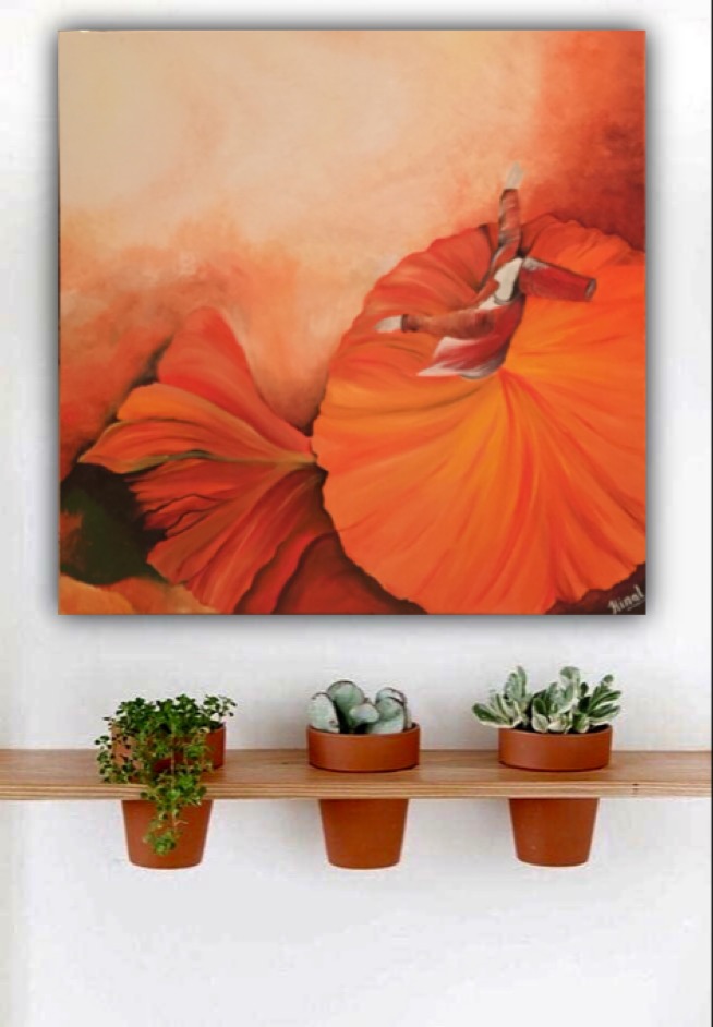 This painting depicts the mood I was in at that time. It was at sunrise that I conceptualised this idea of painting a Sufi dancer thus the shades of orange. I am trying to show the connect of the earth and nature with the Supreme! There’s a flower too in Orange.