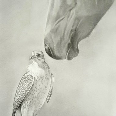 "Acquaintance" – Original Graphite Drawing of Horse and Falcon (41 x 83 cm) Experience a moment of serene connection between two majestic creatures in this original graphite drawing titled "Acquaintance." This large-format artwork (41 x 83 cm) captures the delicate interaction between a horse and a falcon, rendered in meticulous pencil detail. The composition reflects themes of curiosity, mutual respect, and the silent communication between species, inviting viewers to explore the depth of interspecies relationships. The monochromatic palette emphasizes the intricate textures and forms, making it a striking piece for any art collector or nature enthusiast. Features: Medium: Graphite on high-quality paper Dimensions: 41 x 83 cm This piece is ideal for those who appreciate detailed pencil art, equestrian themes, or unique wildlife representations. It serves as a captivating focal point in living spaces, offices, or galleries.