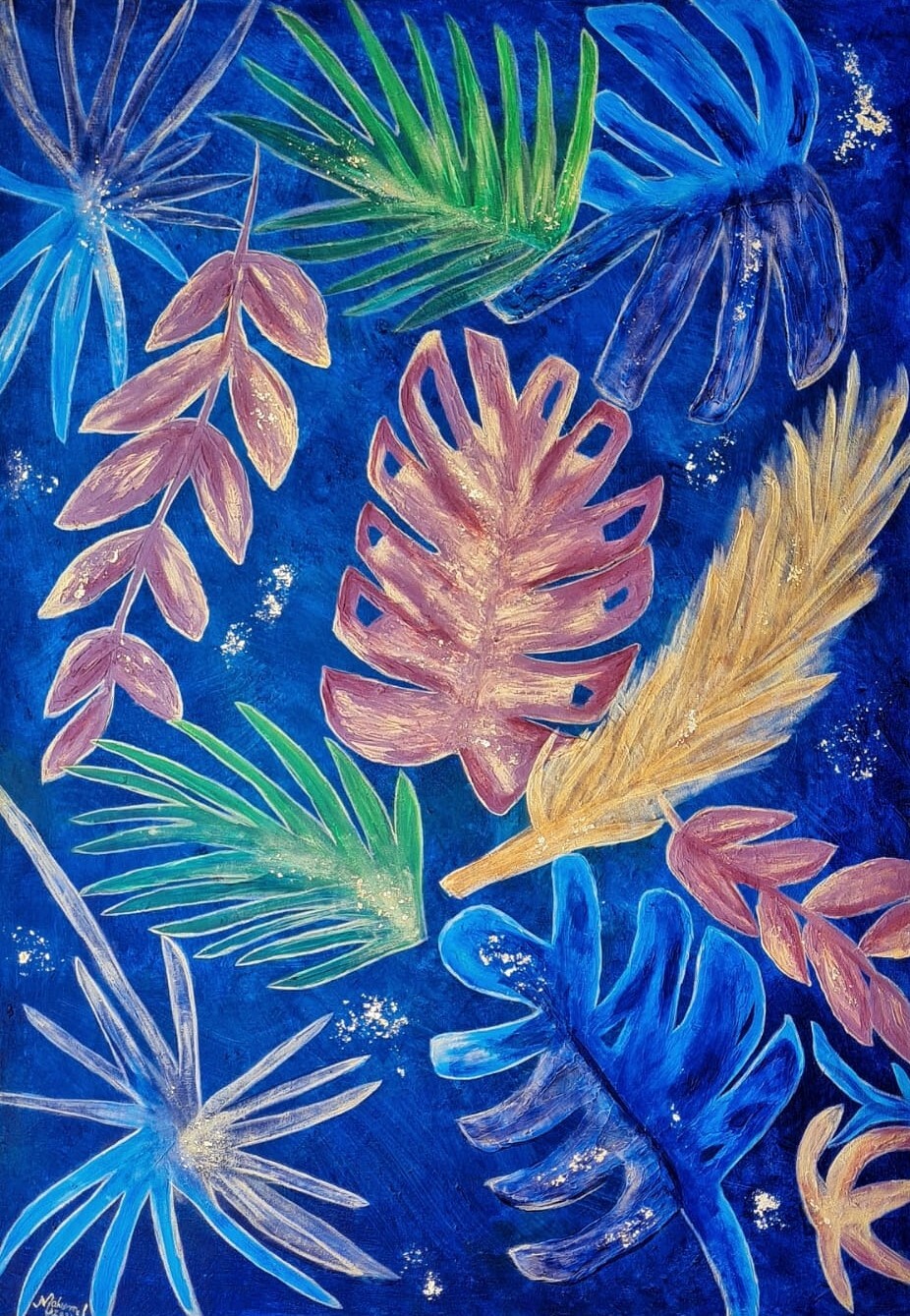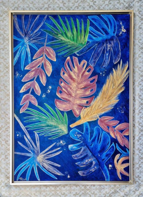 Alluring flora is mixed media, impasto art on canvas with details of gold flakes. Completed with a subtle color of framing, which can be fit in any type of interior setting. The overall experience of this painting is to offer a placid and peaceful effect for the viewer.