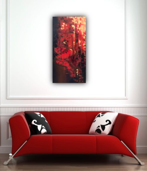 Inspired by the vibrant red colors and the meaning of love, this abstract includes the deep reds, dark oranges, charcoal black, deep blue, and details in light yellow. This piece was painted using quality oil colors and palette knives and also brushes on a gallery canvas. It is a perfect accent piece to accentuate any contemporary or modern decor.