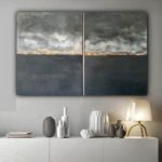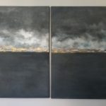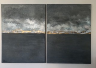 Multi media double paneled abstract sea scape in oils, acrylic and media elements. Depicts a moody seascape over two horizontal panels.