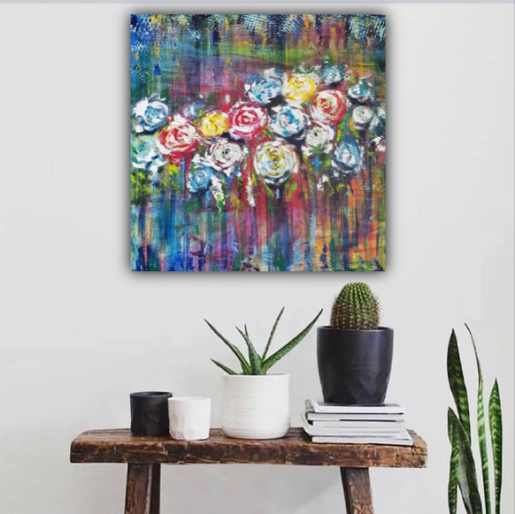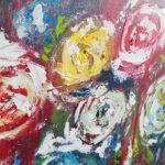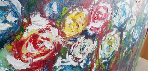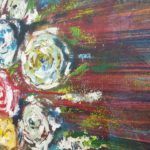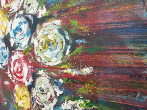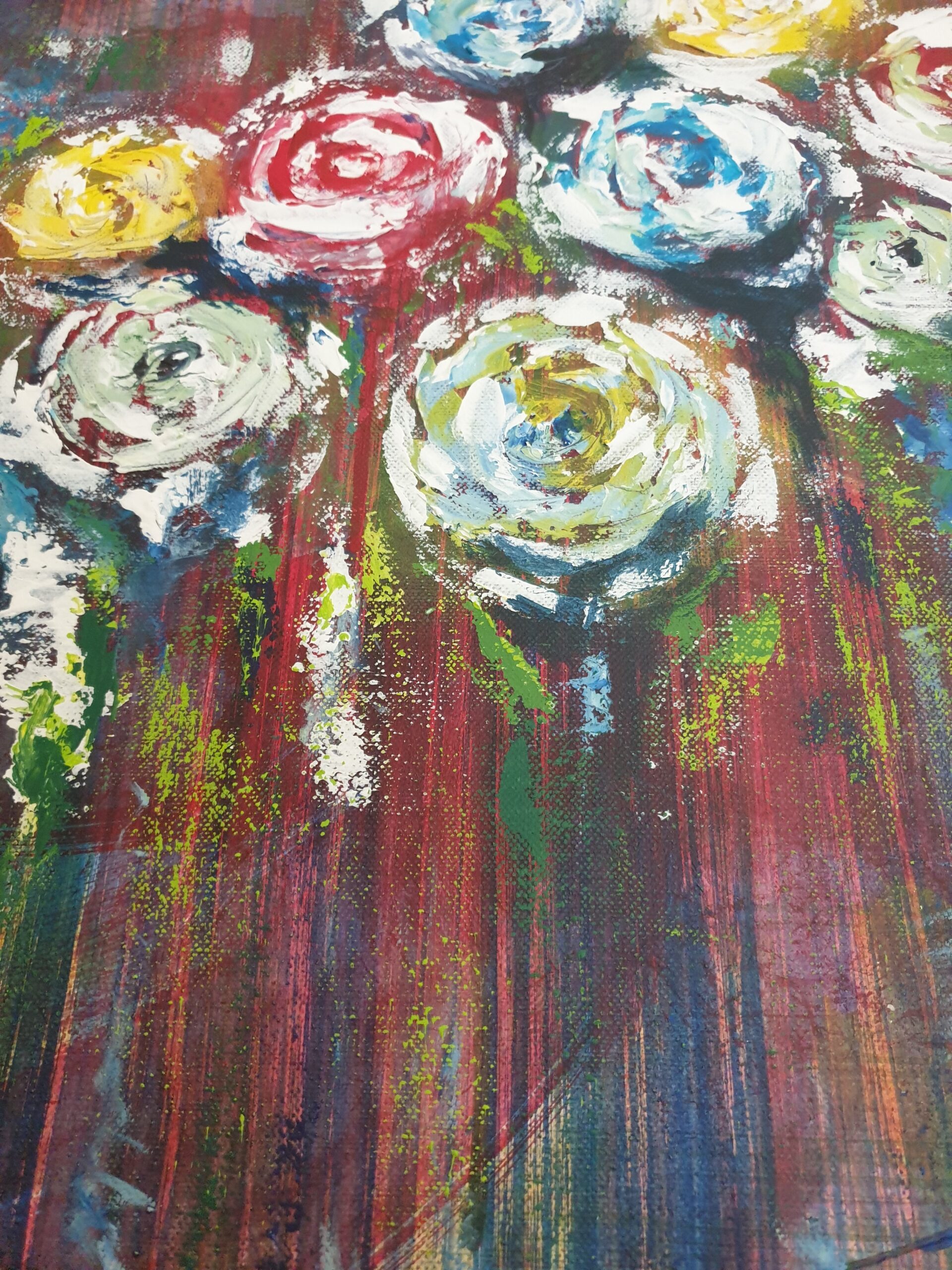 An abstract expression of a carefree life depicted by colorful roses against a myriad web of colors. The painting is subtly textured with layers of colors applied with palette knife. The background is layers upon layers of various patterns and hence gives a beautiful depth to the painting.