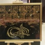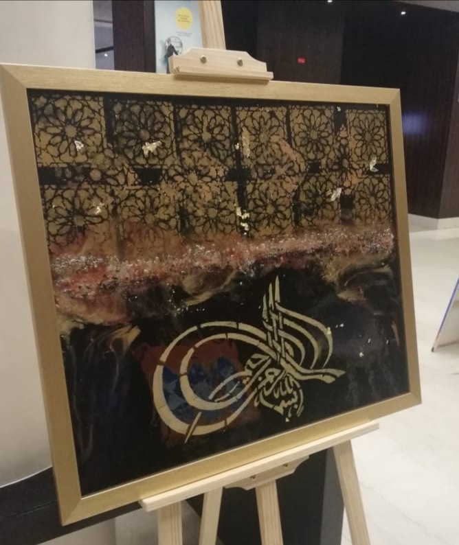 It's a bismillah calligraphy which states that everything I start with the name of Allah Most beneficial the most merciful. Its on wooden board with textures and patterns and calligraphy and sealed with resin pour.