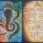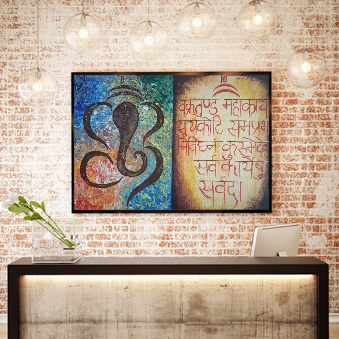 The painting depicts Lord GANESHA with a famous shloka. Lord Ganesha is the god of wisdom and prosperity according to Hindu belief. It says: The Lord with the curved trunk and mighty body, Having magnificence with million suns, I pray to you to remove all Obstacles from the work I do.