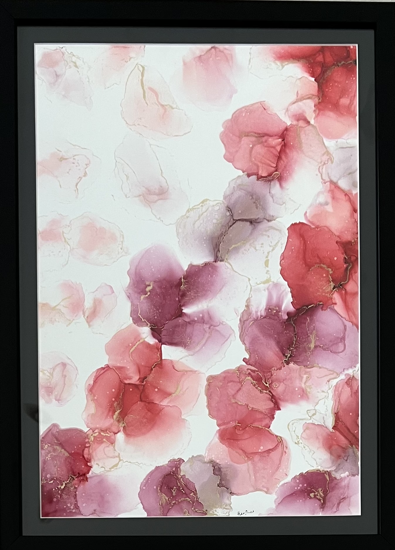 Red; is an archetypal color, the first color humans mastered, fabricated, reproduced, and broke down into different shades. As such, it dominated visual culture for centuries. Putting it into art is a bold statement of power and revolution. Having it as a part of my palette always results in a fun and peppy piece, as is this alcohol ink on round Nara paper. My favorite part about working with alcohol inks is the freedom it permits me to have fun and express myself truly and freely. The myriad of shades of red, going lighter and lighter, exhibit a sense of serenity that I crave from any artwork I see or make. The Roses canvas remains one of my favorites as roses always are a symbol of unblemished elegance. The golden detail separating each rose is to define each rose as its own unique entity. These pieces are truly that pop of color and pep that every home needs!