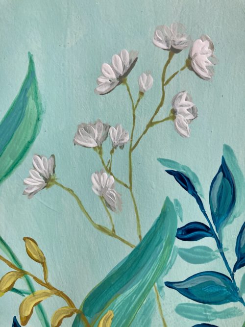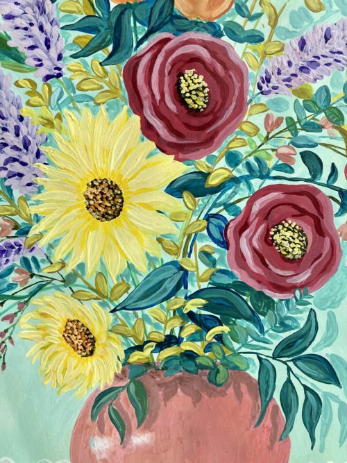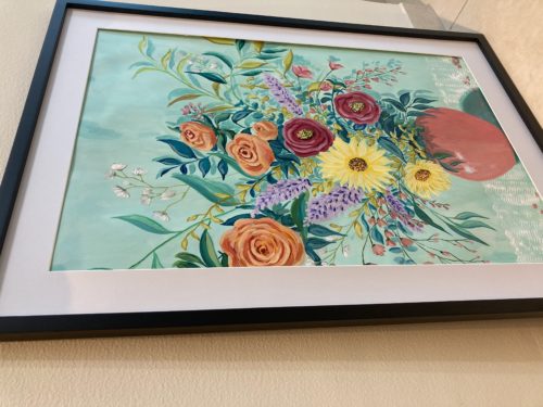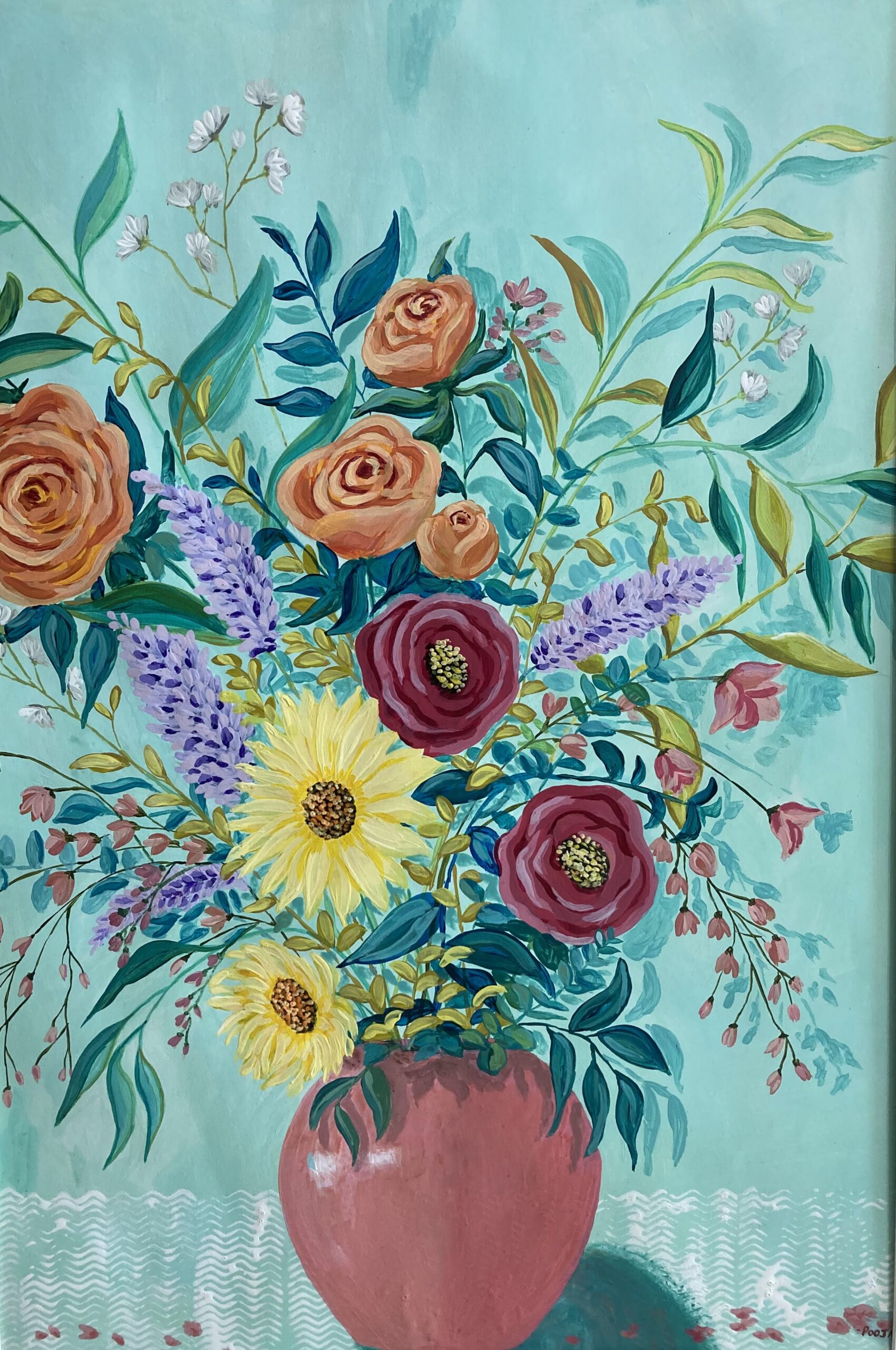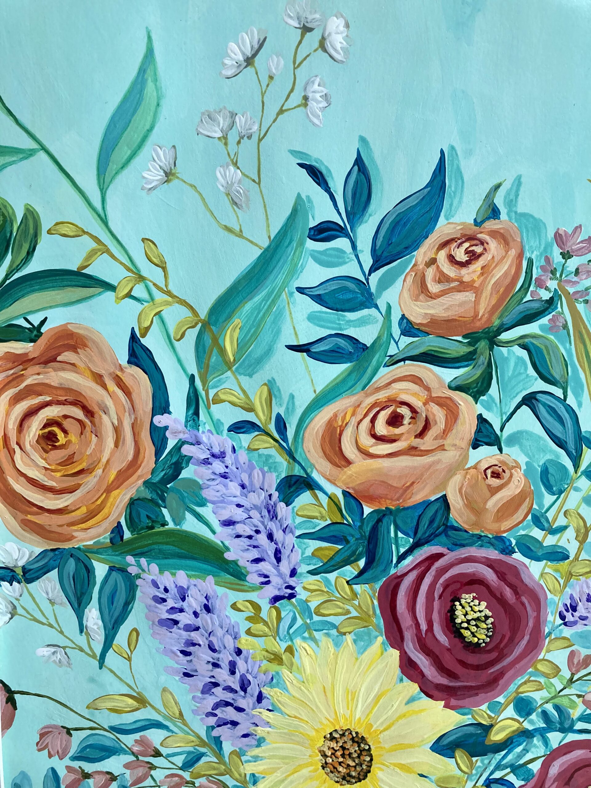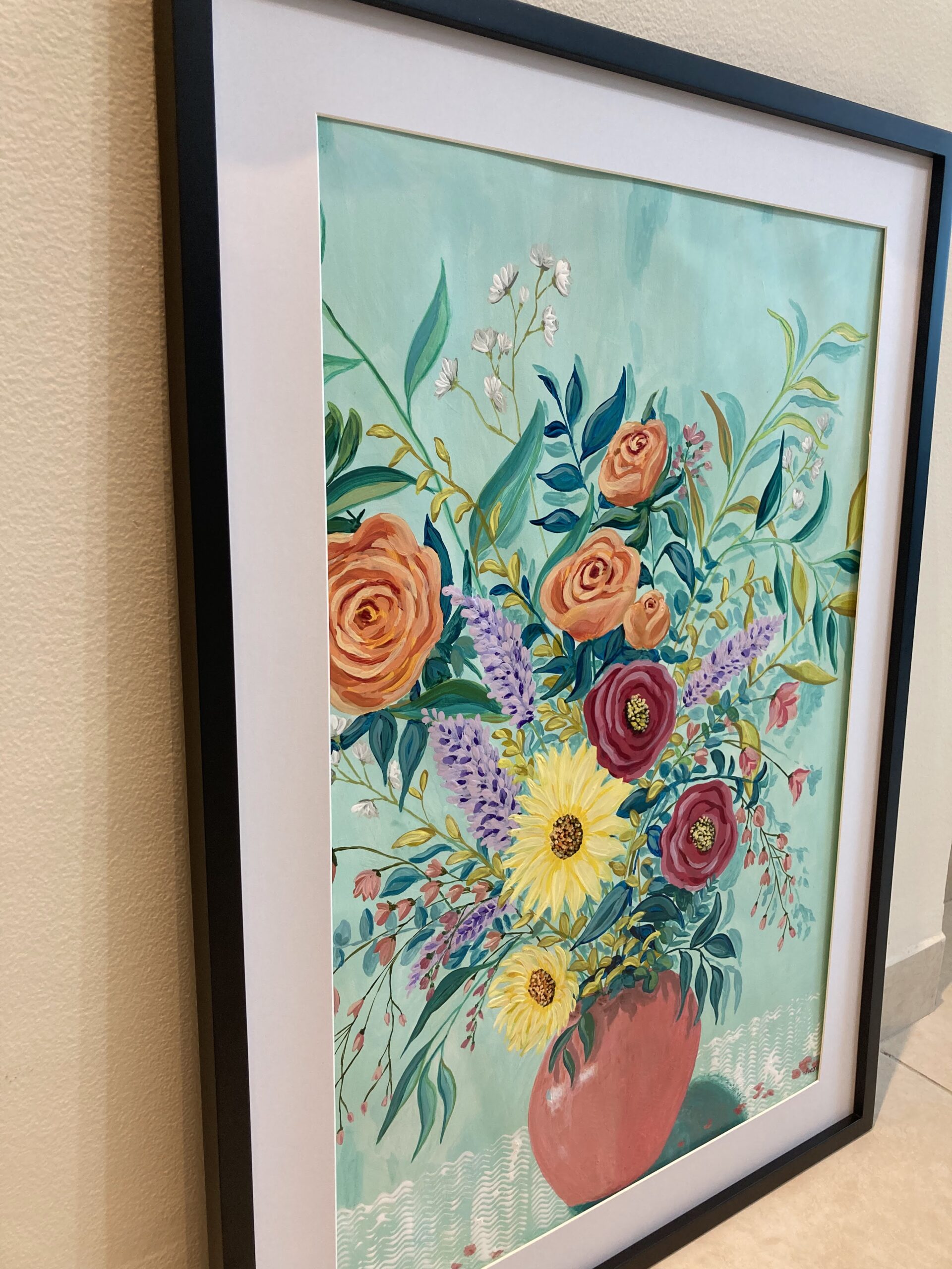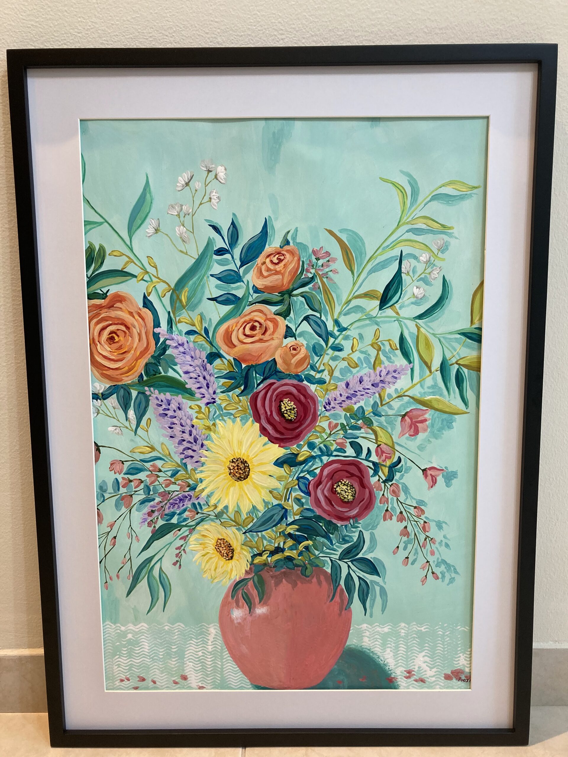 This abstract floral painting is vibrant and full of light and I hope it brings you joy and warmth. It is a bright and cheerful artwork and would add a pop of color to any room in your home. This is a handmade acrylic painting of 60 cm x 40 cm on 250 gsm paper. Colors on the painting might vary slightly from what you see due to screen color settings.