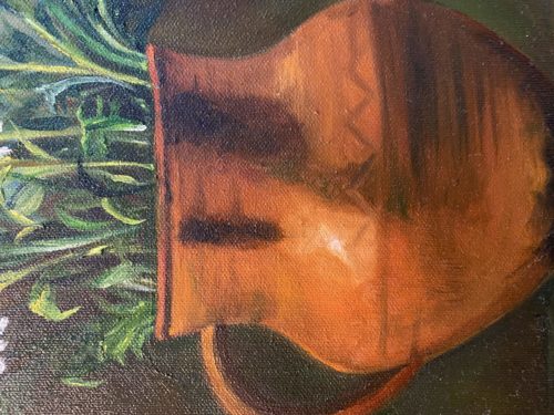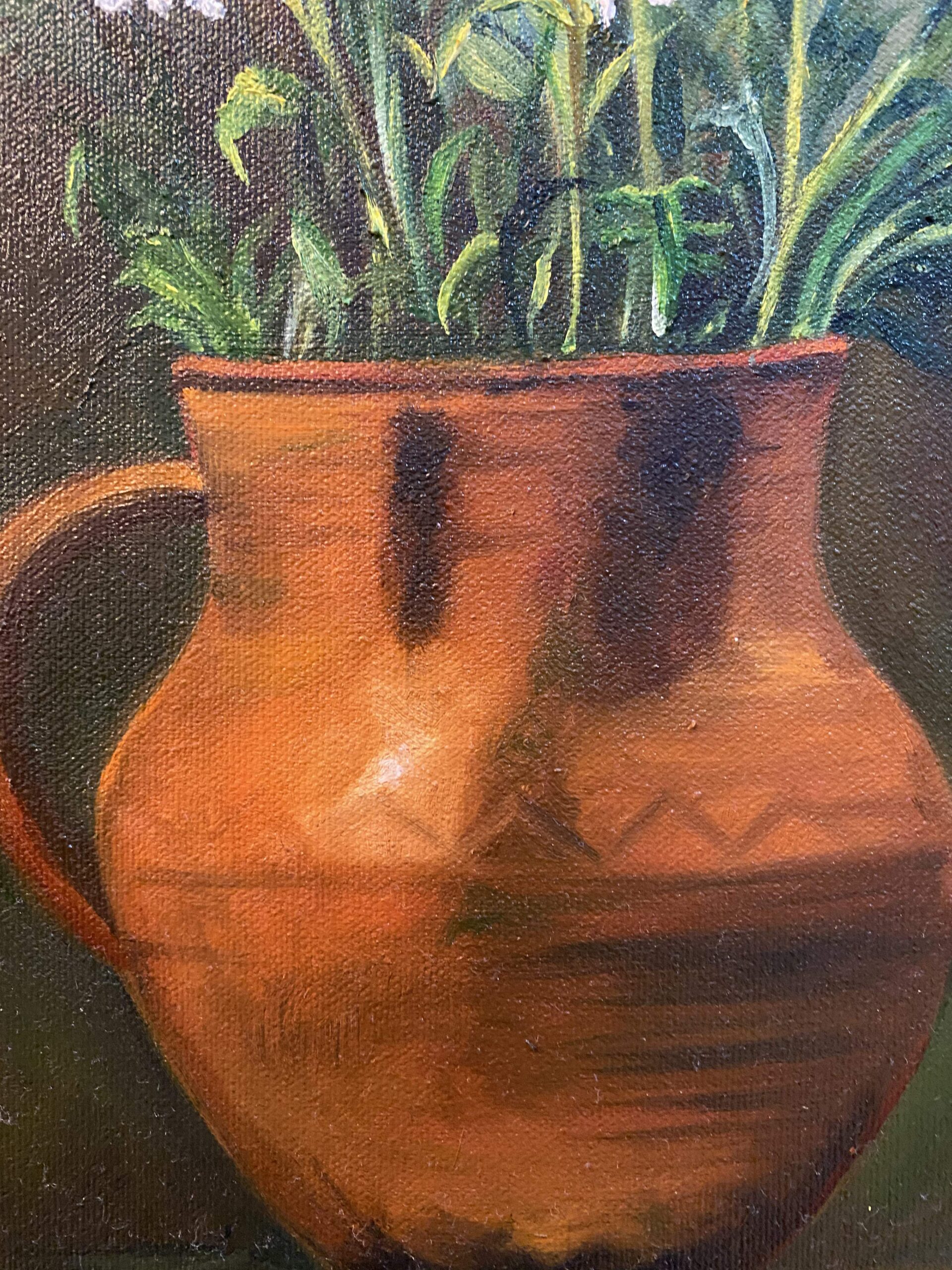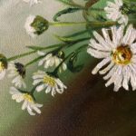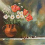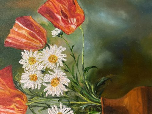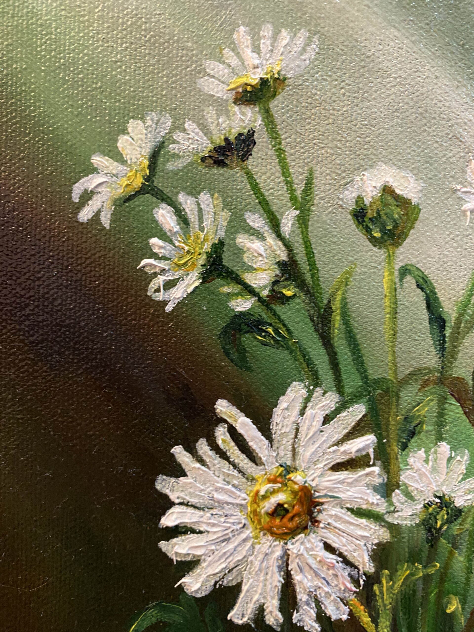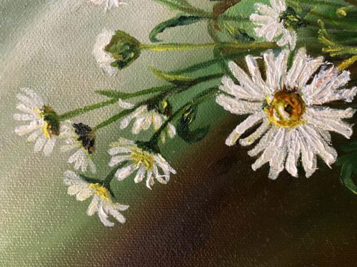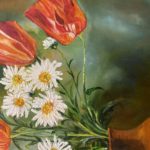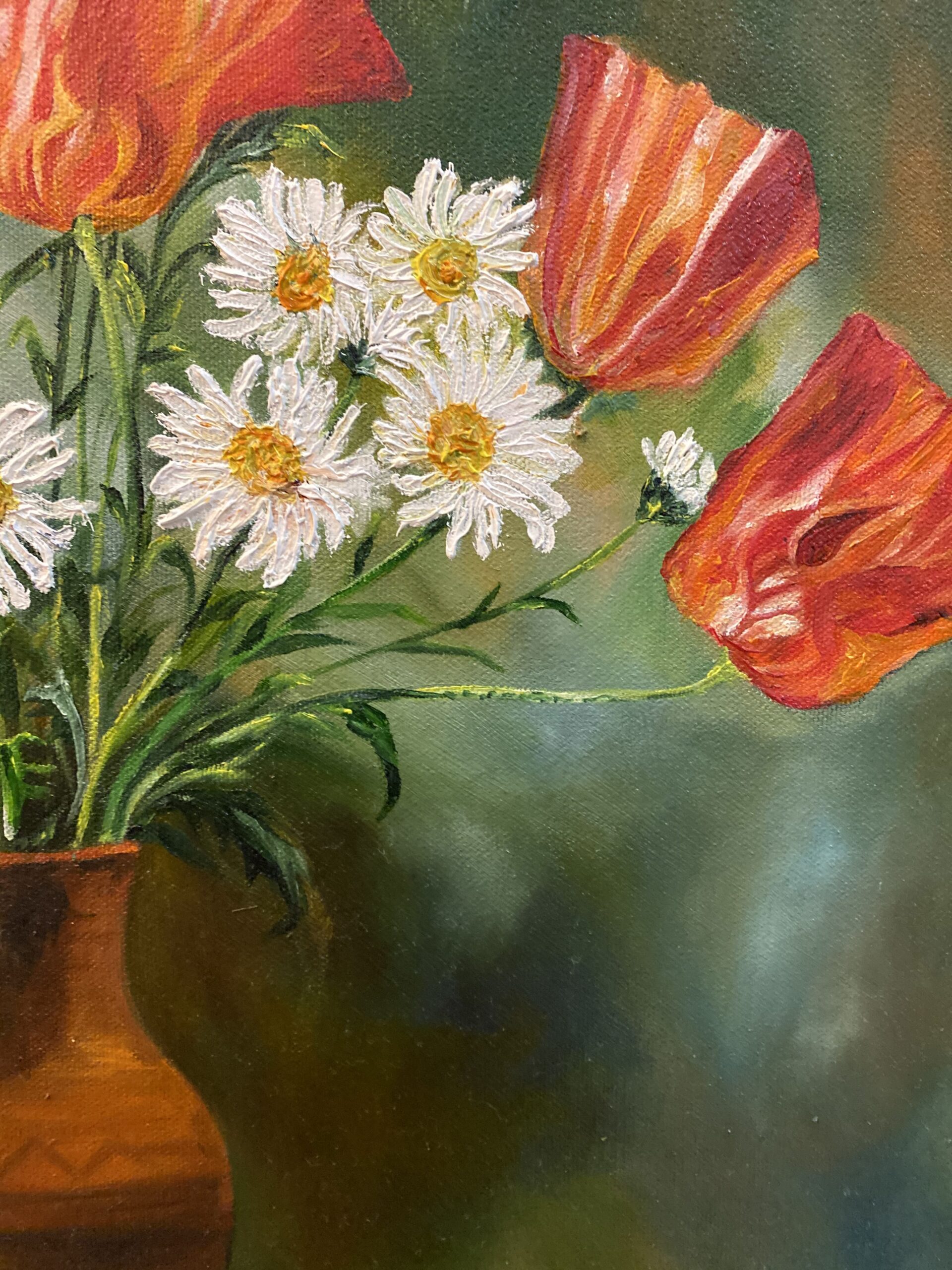 "A flower doesn’t think of competing with the flower next to it - it just blooms." This painting is a still life painted primarily with oil colors on fine quality canvas. Palette knife technique is used to show the bright daisies and red flowers. Theres a good play of light and shadow which is the focal point of this painting. The bright flowers pop up against the dull background. The overall composition of the painting looks balanced. It is ideal to place by the dining area or in the living room.