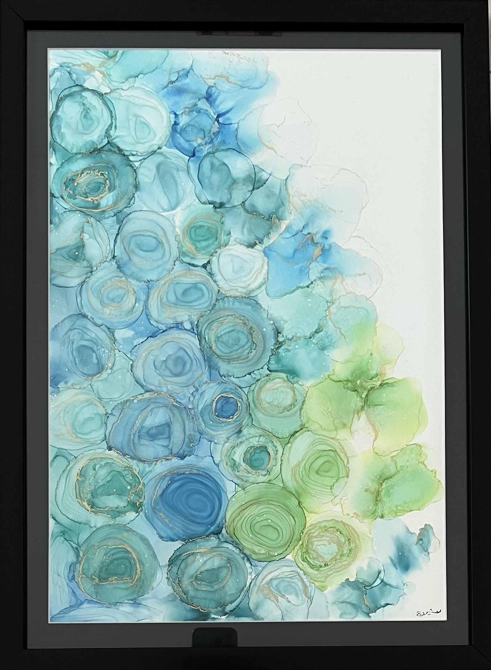 When you hear rose, you see red, and as much as I love myself a splash of red on my color palette, there's something about the quirk of blue in a flower that stands out to me. Blue shows trust, serenity, and responsibility. It is a color that I love for the way it simply makes anything look calmer and makes you feel instantly humbled. My thought process behind the fusion of blues with browns and pinks was to portray the contrasting effect it has to make a powerful color like pink, and a royal color like brown, simply be humbling. Yet again, with the use of alcohol inks, I have created a diffusion of different tones of blue to merge and flow into one another. With each swirl of color, with each swish of one shade merging into another, with each flower co depending on another, this painting makes me feel at comfort and ease.