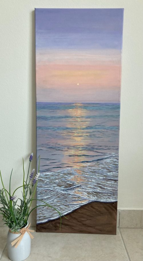 Acrylic seascape painting of a glorious pastel sunset. This soothing handmade artwork will add warmth and beauty to your walls.
