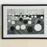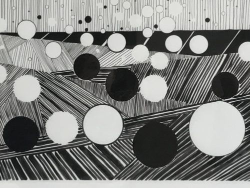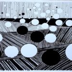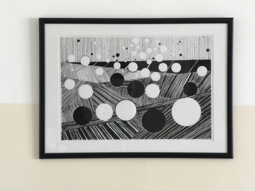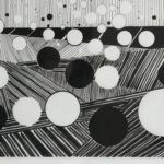 black ink on paper, date 2015, floating circles against background of lines.