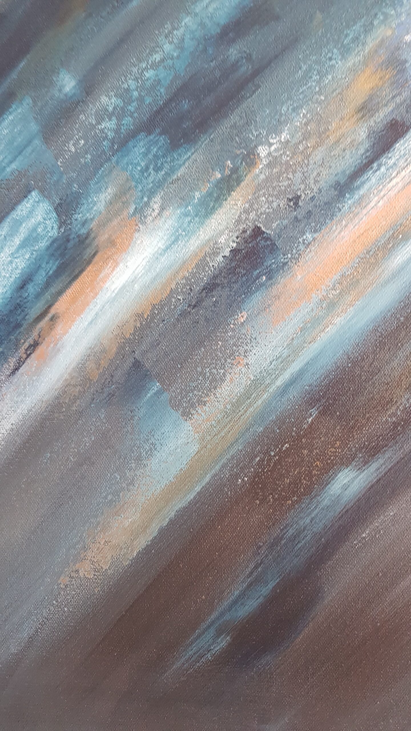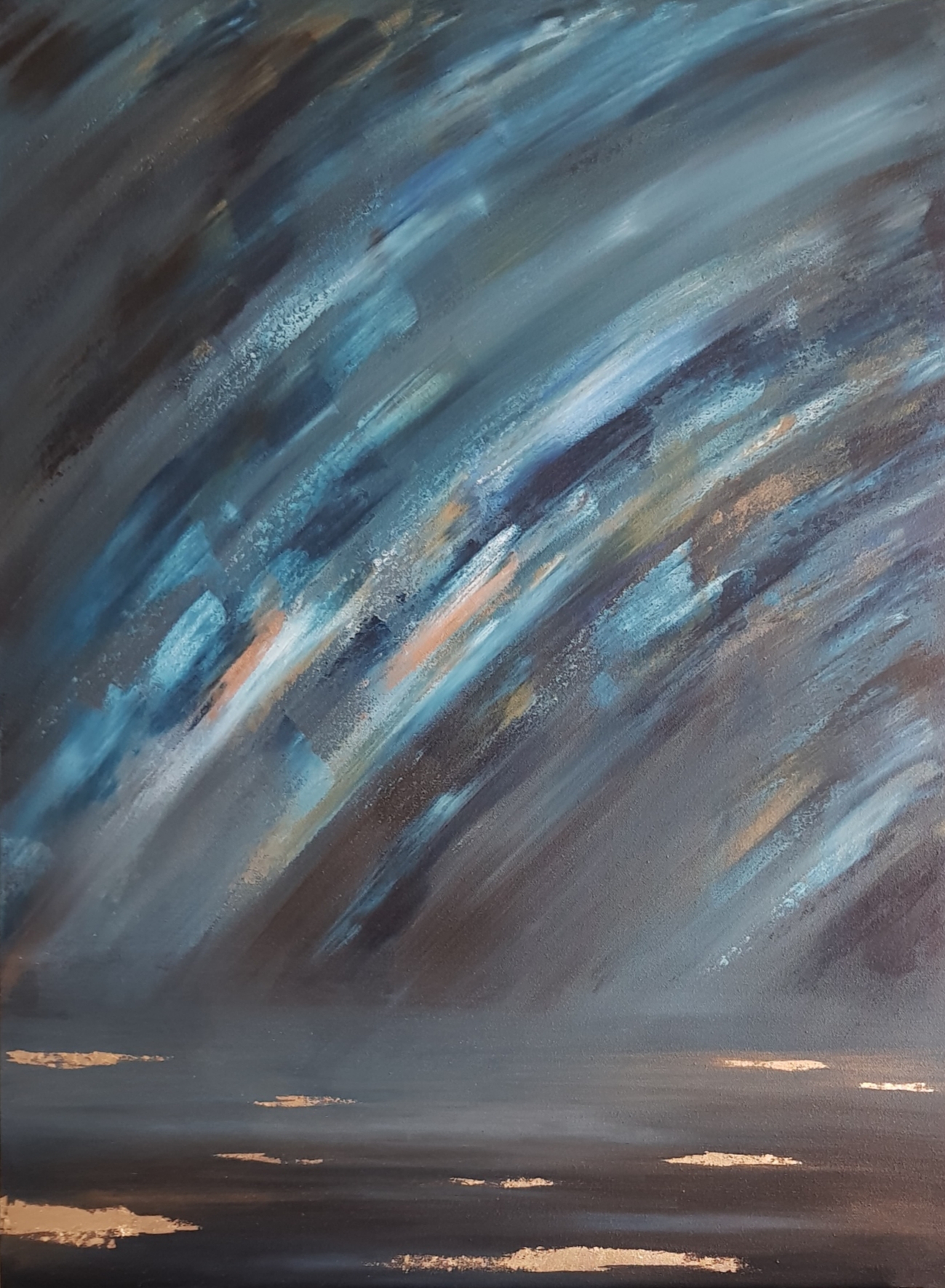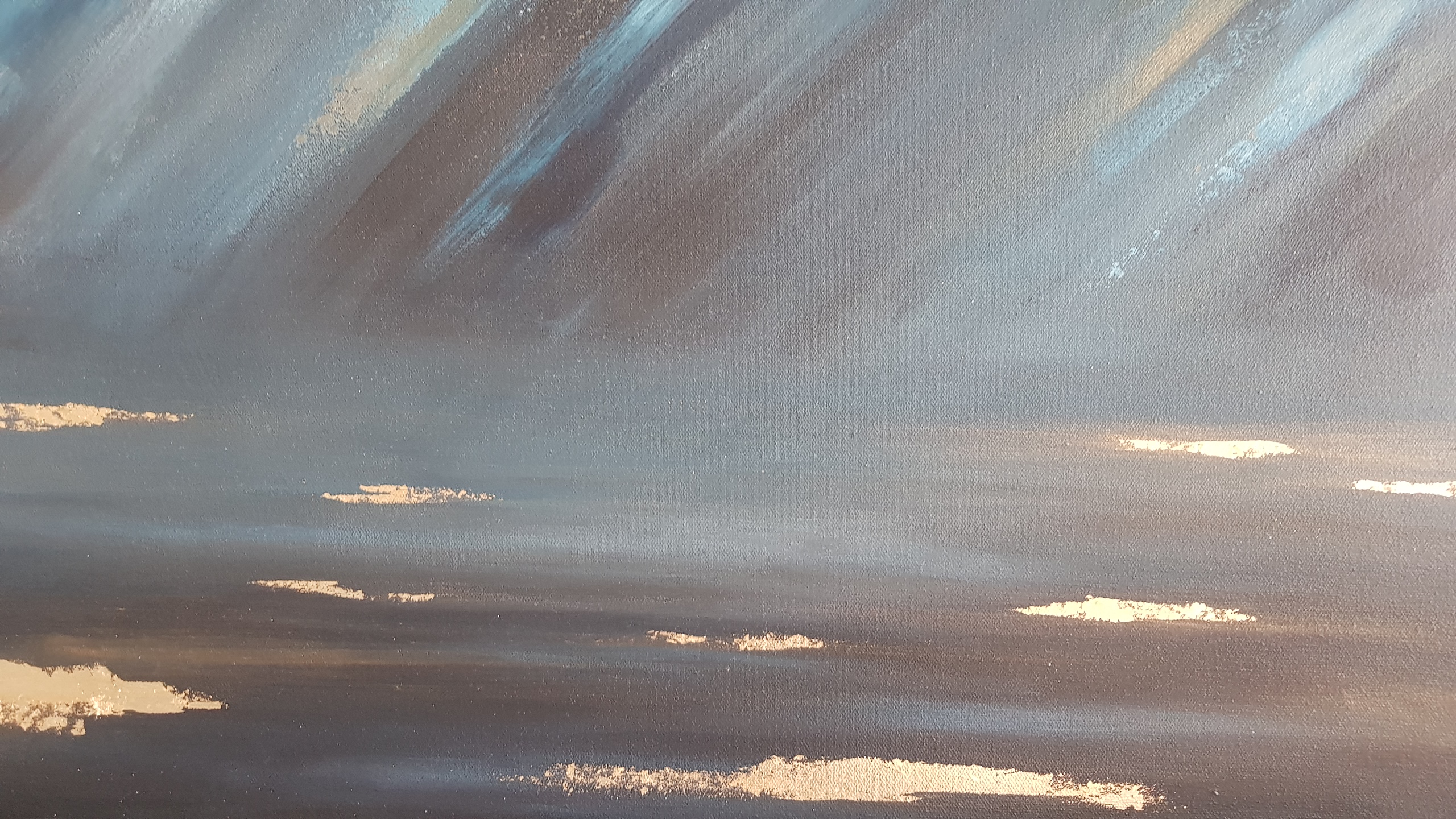 Original, abstract expressionist, mixed media on canvas. This piece is painted with acrylics and gold leaf. It is painted on the sides of the canvas as well and it does not require framing. This painting is fitted with a wall hook and is ready for hanging on your wall. Original and unique artwork signed and dated on the back by the artist.