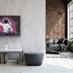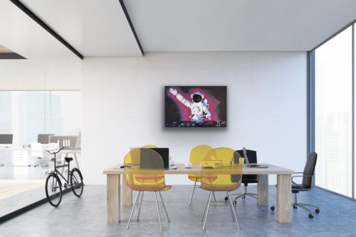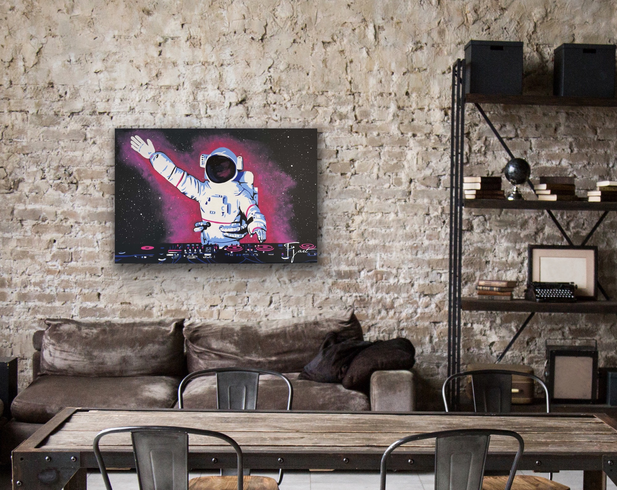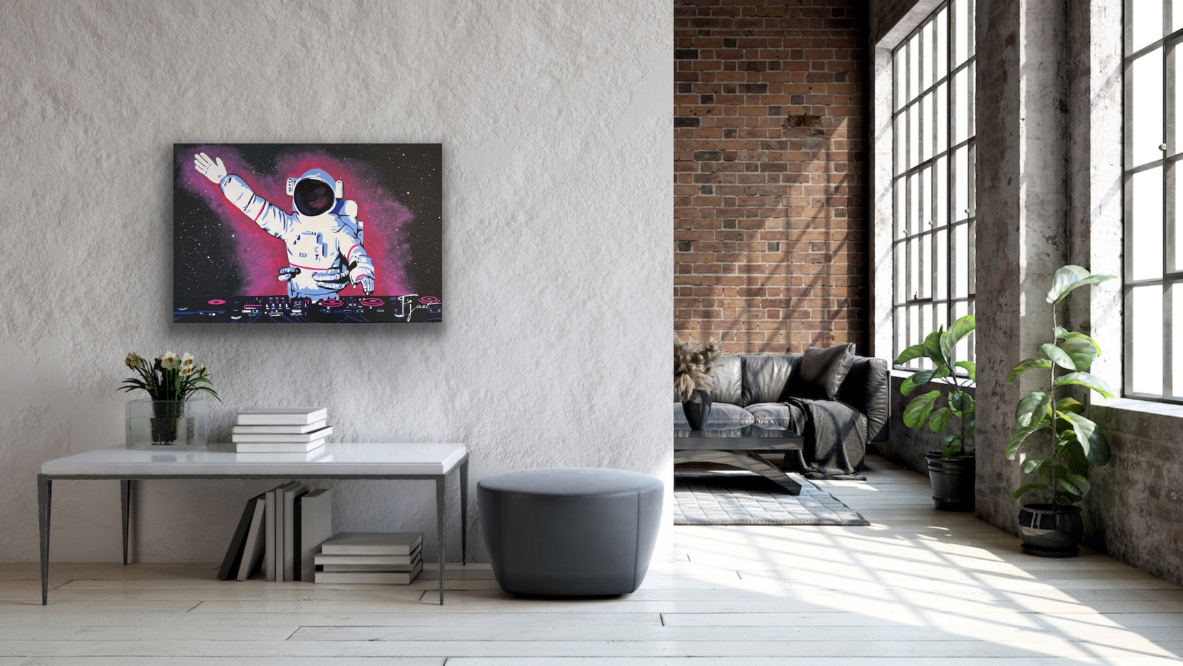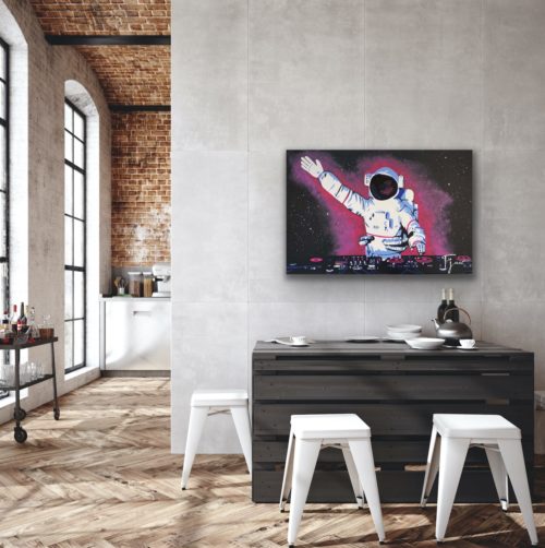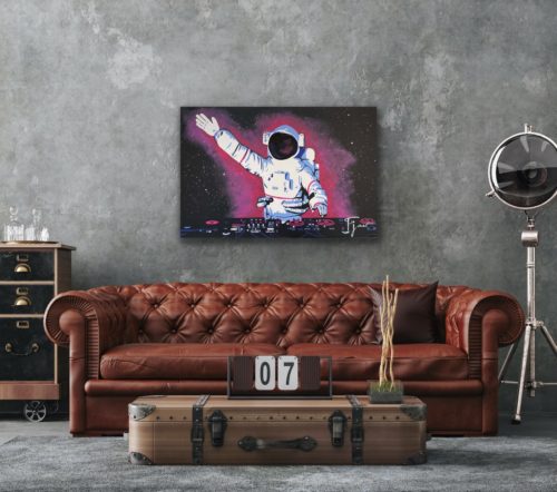 Fleur Josephine, the artist, is frequently asked to paint live at events, this artwork was created at KYO, the Palm. In a few hours the artist had painted the first layer and after the party she continued the creation at her studio. The reason to paint something like this, we know so much about the universe and yet so little, astronauts and space are subjects FJ is fascinated by.