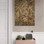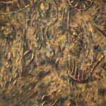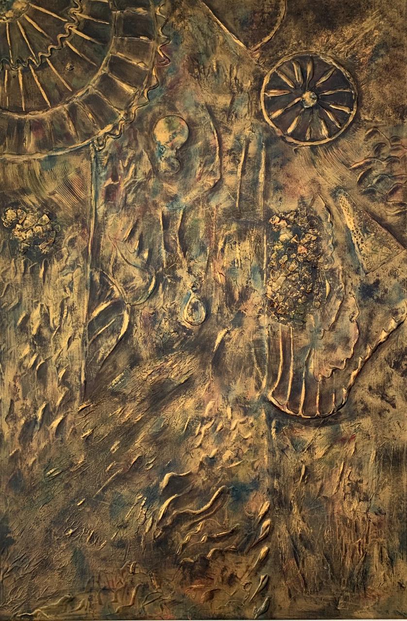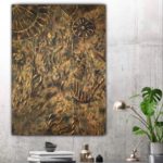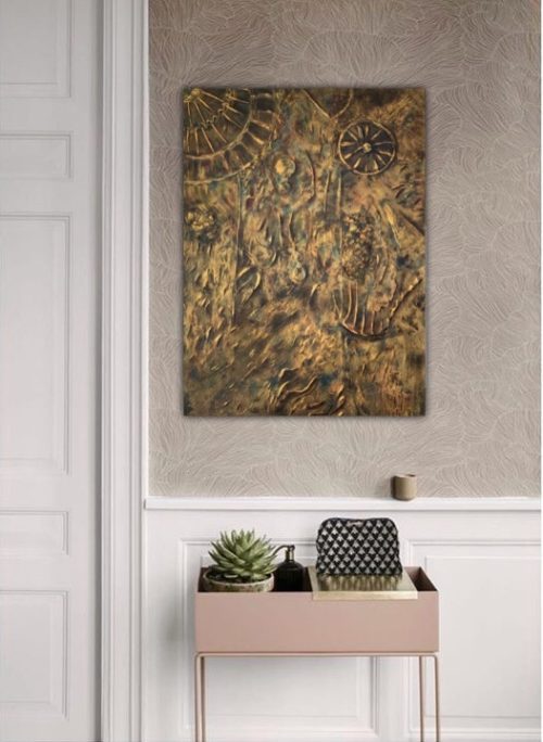 Evolving is a piece created with various textures and techniques in metallic acrylic colors. It is a piece depicting the three time periods Stone Age, Bronze Age and Iron Age. From the Stone age, to discovery of metals in 3000 BC and evolving through Gold, Bronze, Iron, Copper age .. humans have come a long way . This work is a remembrance of that journey from the making of basic tools to the craftsmanship of Eiffel Tower. When we are venturing into the Space Age, lets also take a moment to remember our evolution.