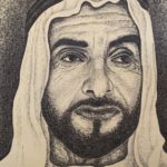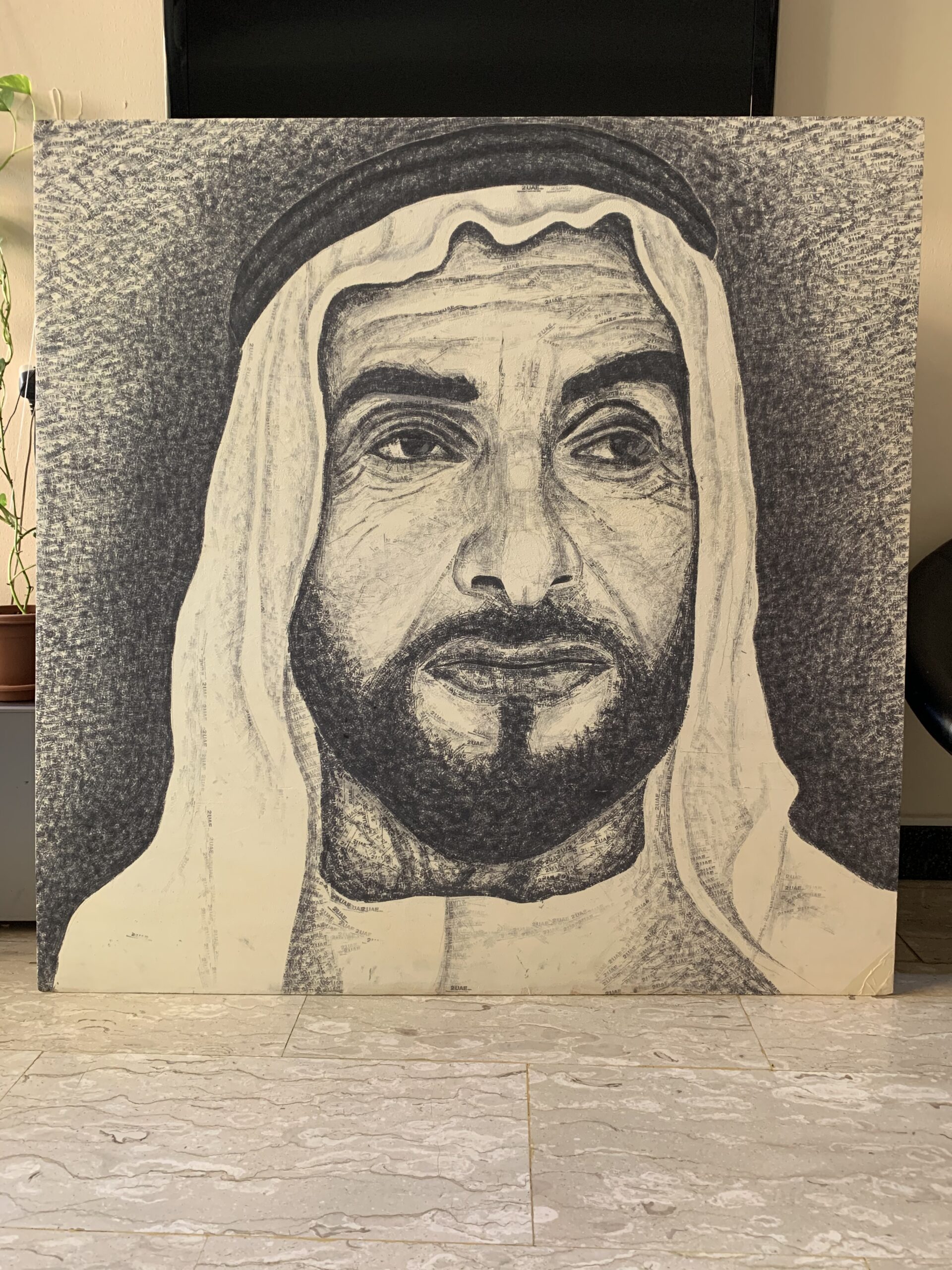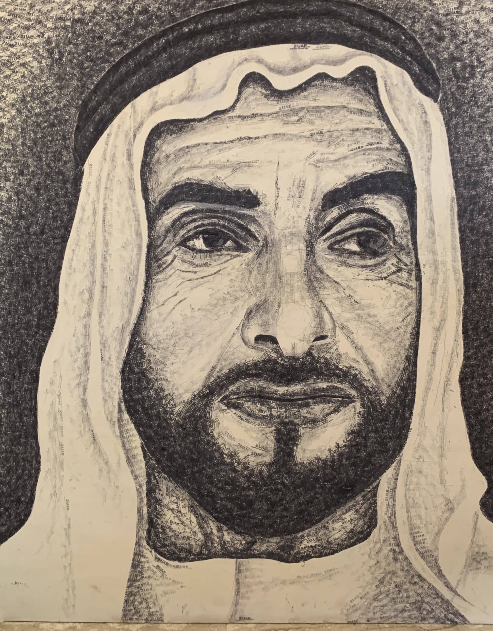 This the special painting , there is not any color or brush is uses to create this masterpiece, only ink stamp were used to create entire painting and almost two month took to finish this masterpiece. Only stamp pad ink and stamp made with text the 48 th national day of UAE. This masterpiece artwork is creates on white piece of plywood