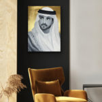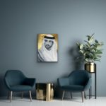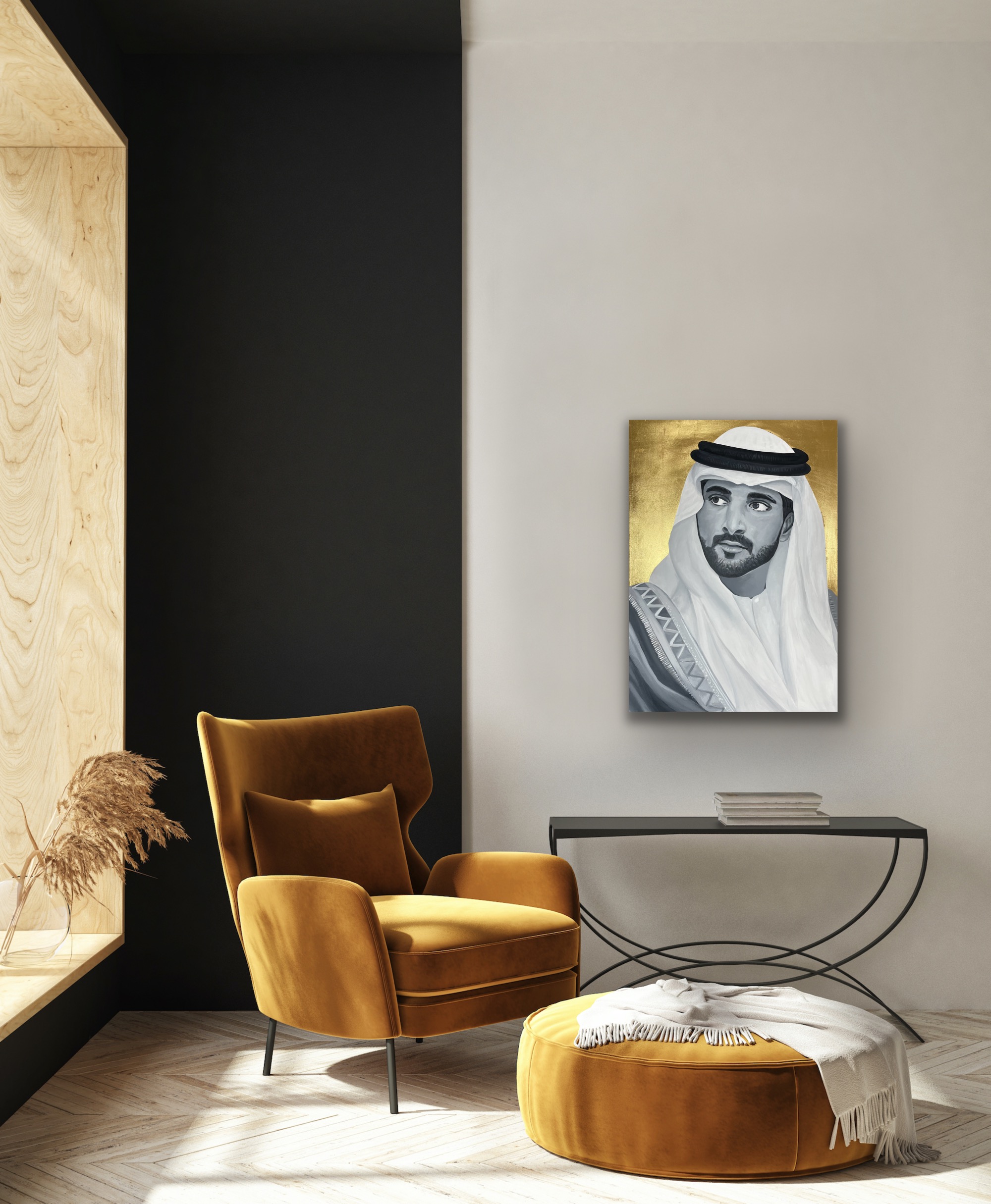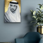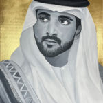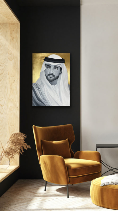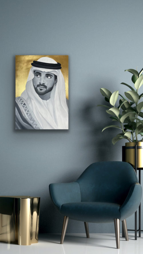 The portrait of HH Sheikh Hamdan bin Mohammed bin Rashid Al Maktoum, Crown Prince of Dubai, also known as Fazza, which means the one who helps in Arabic. FJ wanted to paint him cause he inspires people, he is an artist too, a poet and an animal lover. He is also the head of the Dubai Autism Center and Dubai Sports Council. The artist admirers HH a lot. The background is made with 24 Carat Gold leaf.