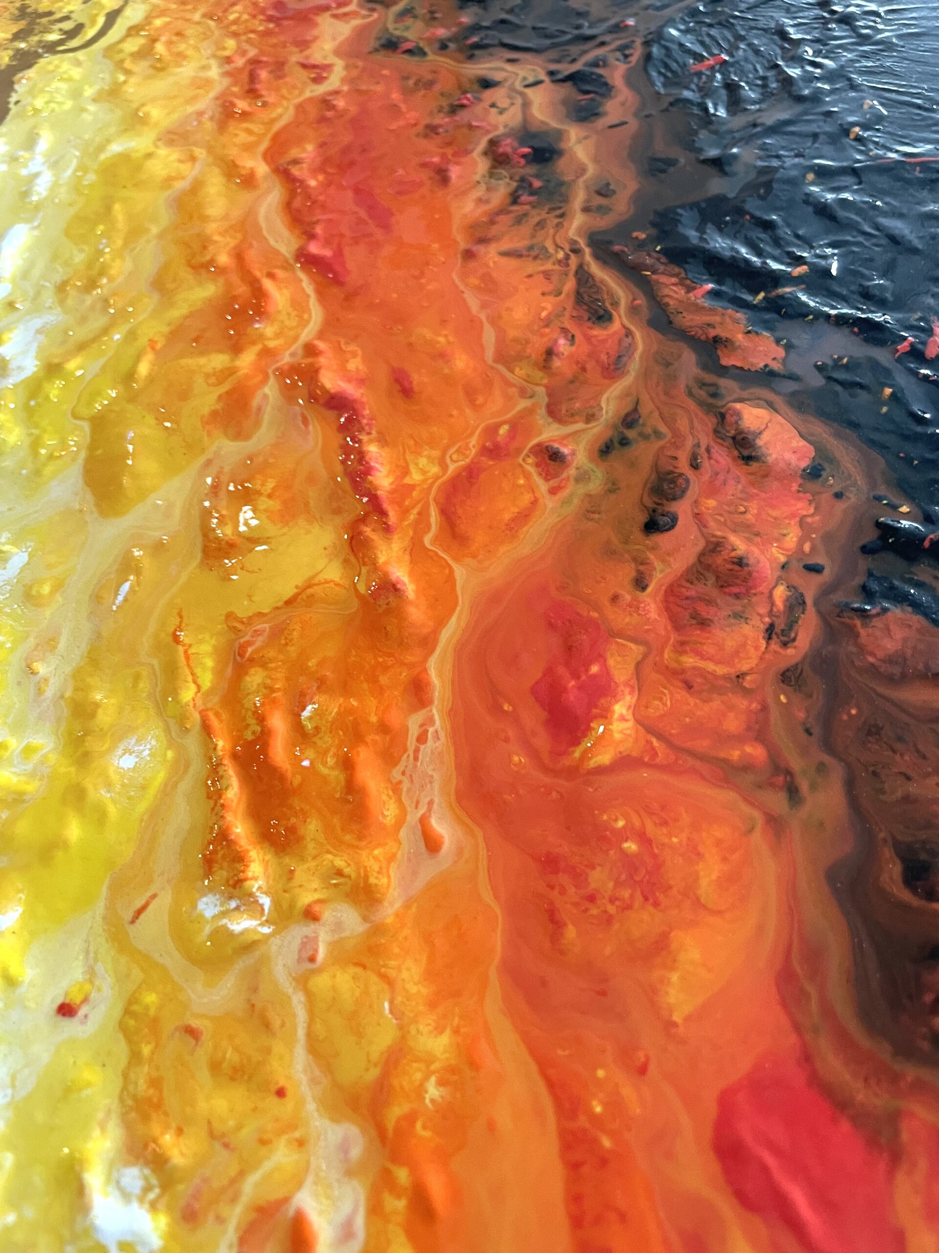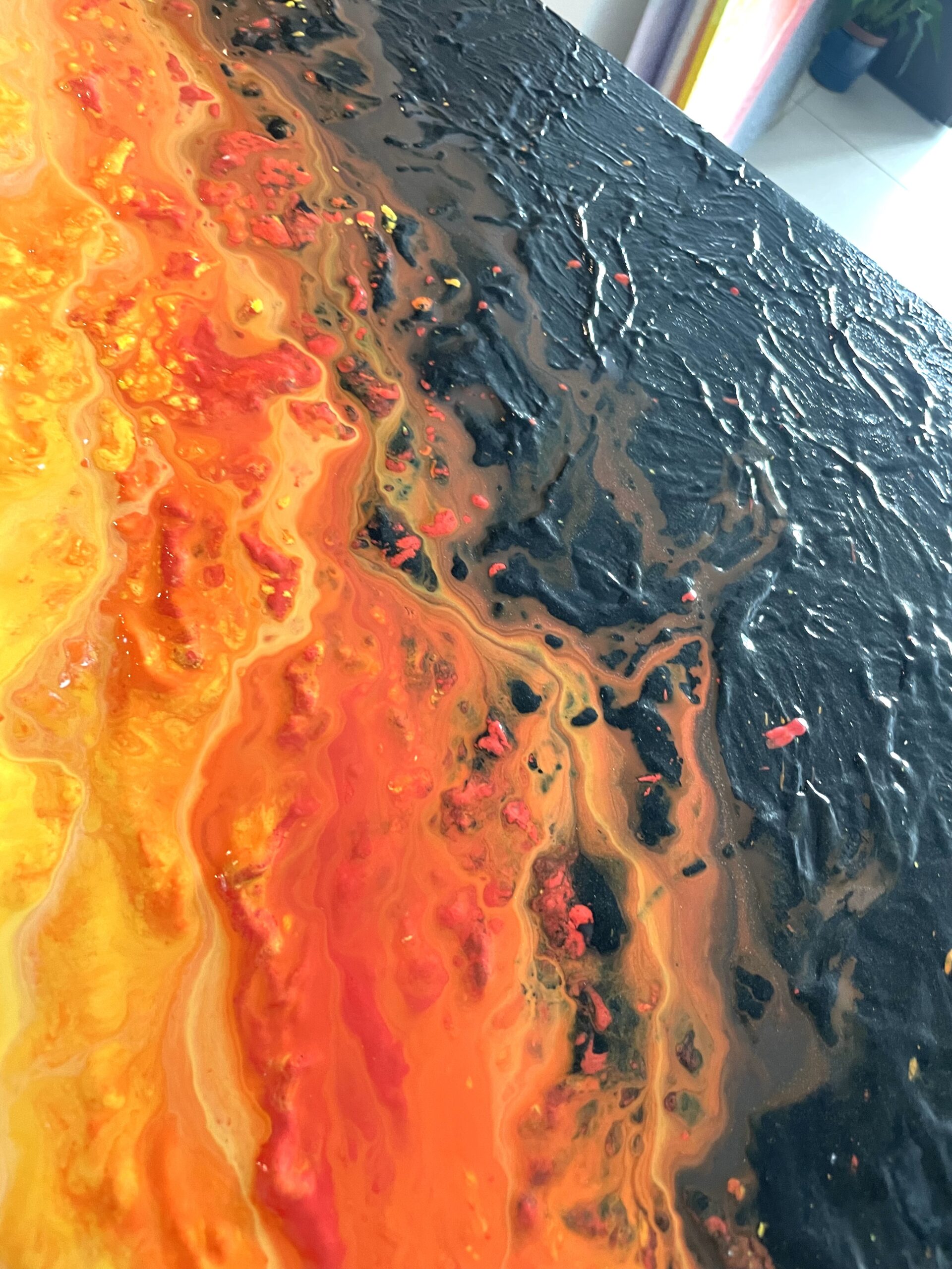 The title of the artwork is “fire” I used acrylic, and heavy texture on canvas One side it shows the light and other side the rough land with stones This is fluid art This type of artwork is now a days trending and it is also called modern art Fluid art is very interesting art I always feel happy while doing this type of artworks This artwork will give you the feeling of Bonfire.