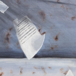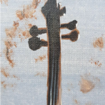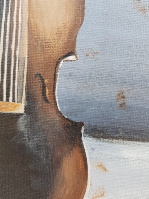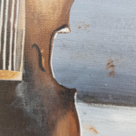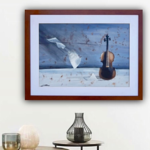 Acrylic on canvas This beautiful painting is inspired by a story of a young girl who fell in love with a violinist.. As her lover spent so much time with his beloved instrument, the girl grew jealous of the violin! Her dream was to magically blow the music notes and the violin far far away and can finally have her man all to herself.. By Artist: Aster Nashaat Size: 50x35 cm plus frame making total size 65x50 cm Original with a certificate of authenticity