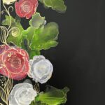This is another artwork in my series with black backdrops. It has been giving me a sense of pleasure to create this unique artwork with contrasting backgrounds. These make the artworks seem more highlighted and bright and give a sense of a 'spotlight' effect to anyone that looks at it. It is different from usual art pieces that often have a white background. The contrast livens up any space that it is put in. It brings about a modern and minimalist look that is sure to keep on-lookers engaged. This artwork further combines my love for all things floral; specifically roses, with alcohol inks. I have tried to use contrasting imagery to highlight each and every petal and fold in this beautiful flower. The shimmery tones add a touch of glamour to the artwork and further emphasise the shape of the flower. They also pop in a unique manner against the black paper giving it a different look altogether.
