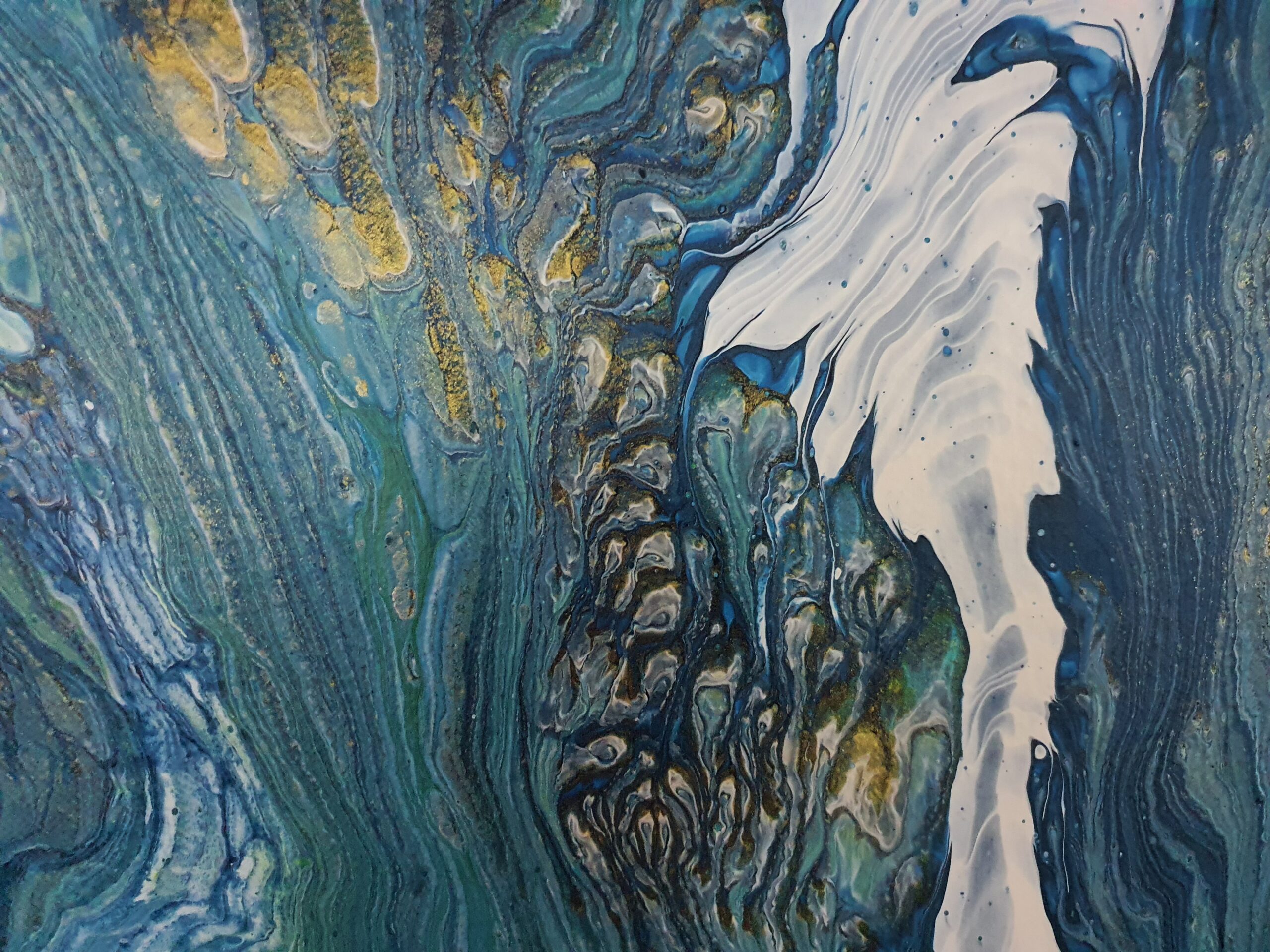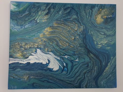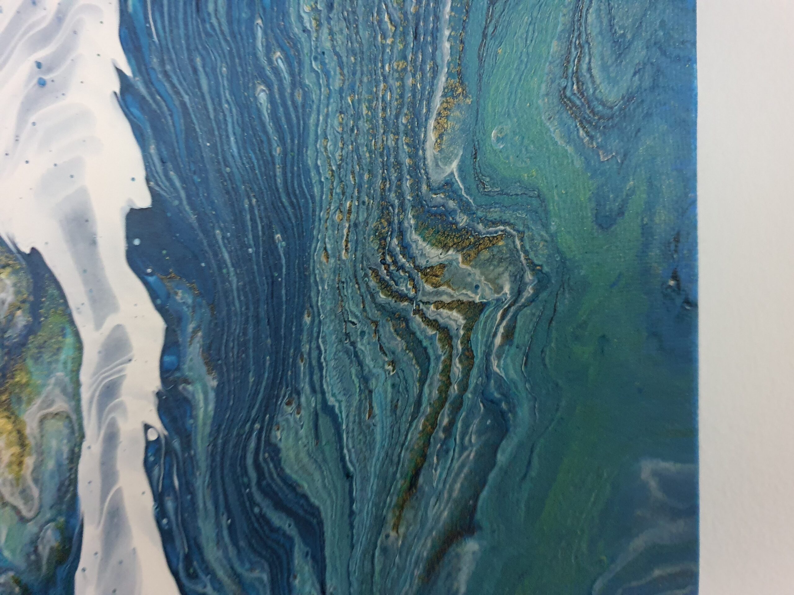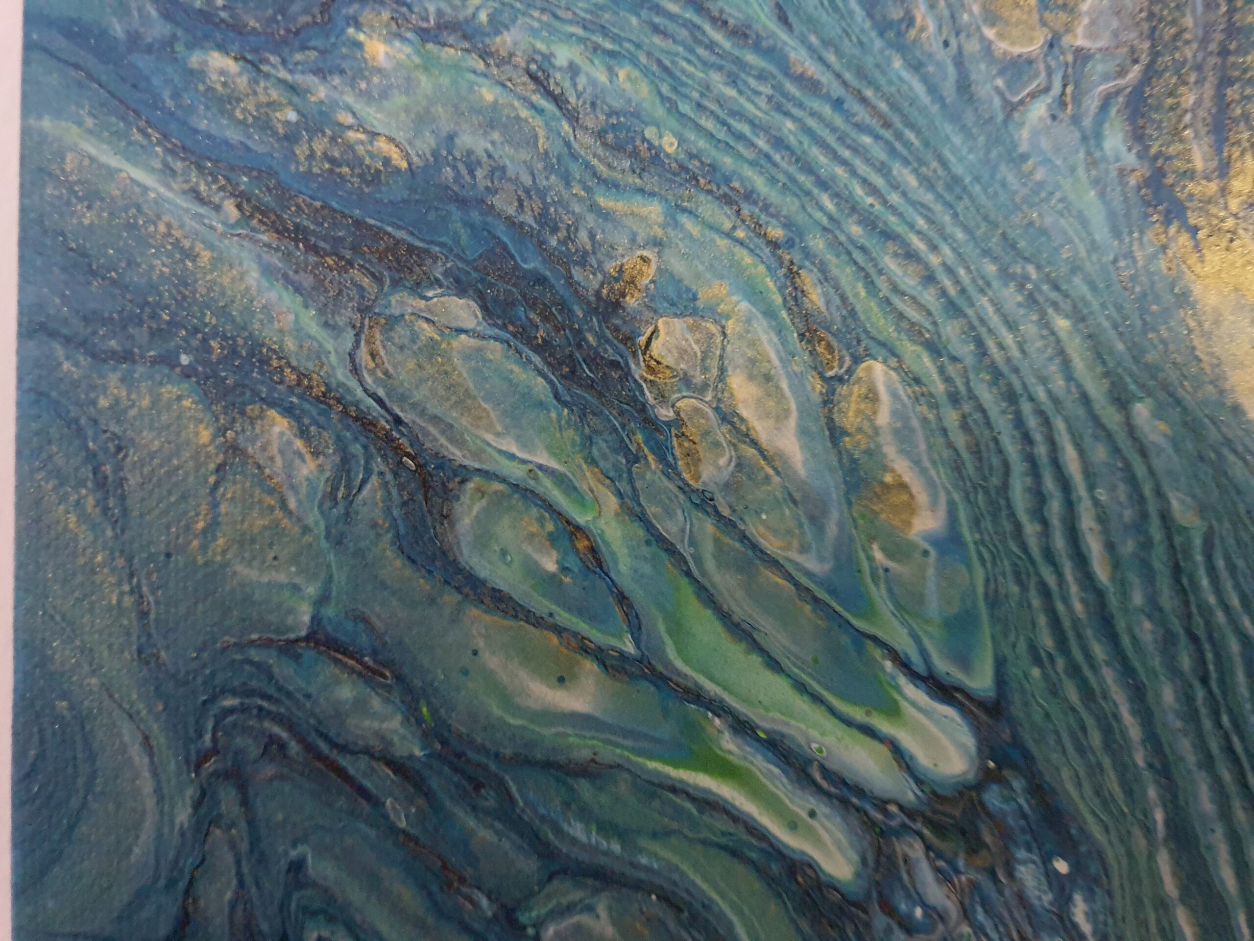 Gold Rush Under the Ocean I is the first of a twin set of original fluid acrylic pour painting on a 16 x 20 x 1 inches (40 x 50 x 2.5 cm) stretched canvas. The painting depicts beauty using a palette of cool and calming colours of pewter, blues, turquoise blended with gold and a hint of light green soothing to the eye and white. This distinctive painting filled with beautiful effects, depths and flows with gold shimmer evoking luxury, currents and weightlessness. This is a quality painting with the edges painted in acrylic paints. It does not need to be framed before displaying. The painting can be displayed as one sees fit.