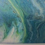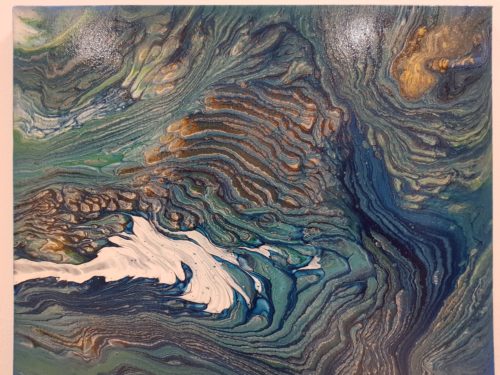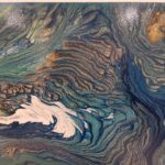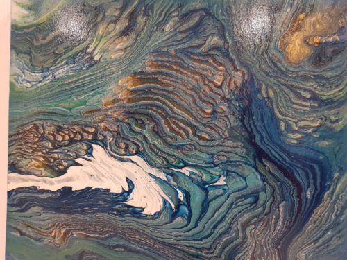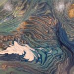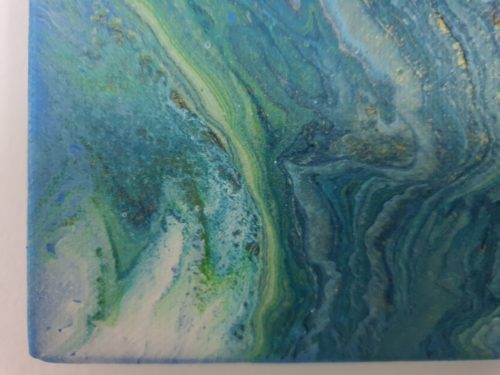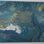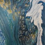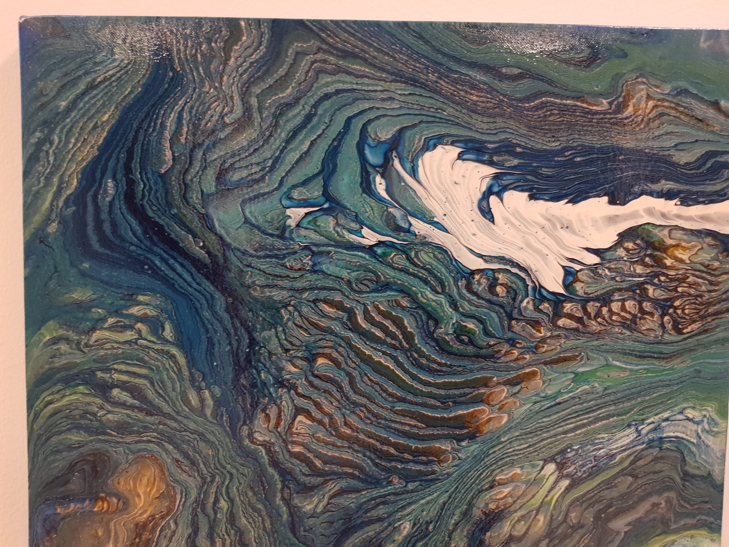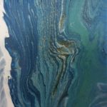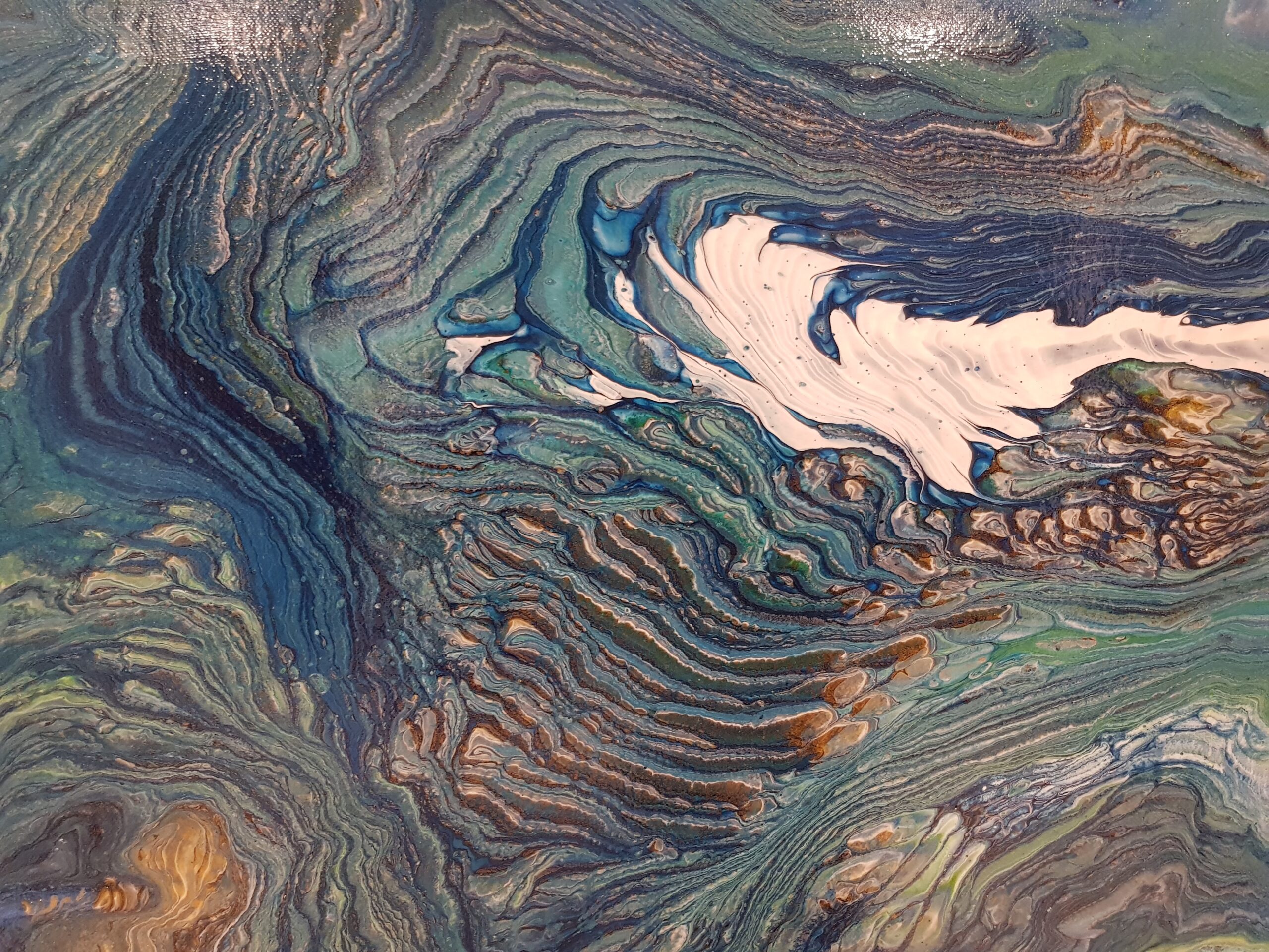Gold Rush Under the Ocean I is the first of a twin set of original fluid acrylic pour painting on a 16 x 20 x 1 inches (40 x 50 x 2.5 cm) stretched canvas. The painting depicts beauty using a palette of cool and calming colours of pewter, blues, turquoise blended with gold and a hint of light green soothing to the eye and white. This distinctive painting filled with beautiful effects, depths and flows with gold shimmer evoking luxury, currents and weightlessness. This is a quality painting with the edges painted in acrylic paints. It does not need to be framed before displaying. The painting can be displayed as one sees fit.