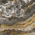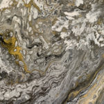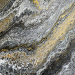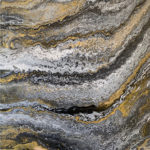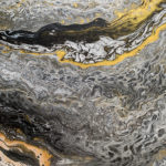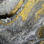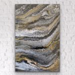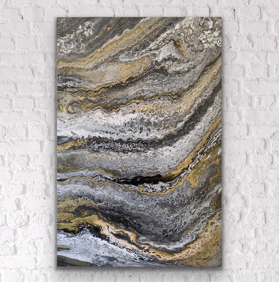 A fluid acrylic pour painting on a stretched canvas made with metallic gold , silver and obsidian colors .