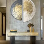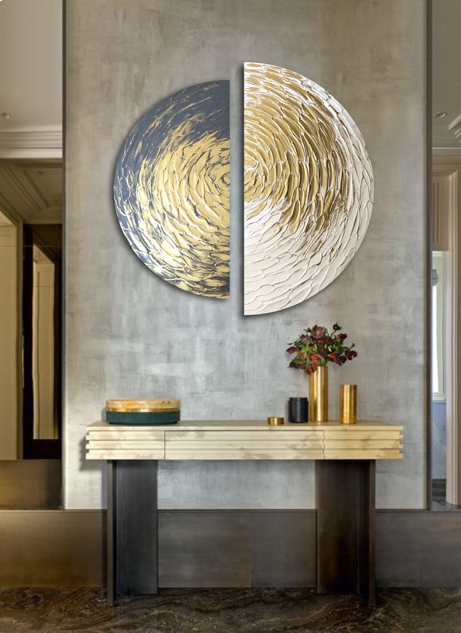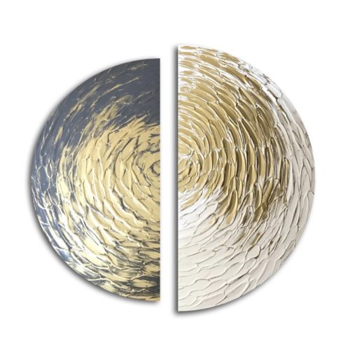 Acrylic texture painting with dark gray and white with golden touch made on wooden frame, half circle shape, two pieces set total size on wall is 120x120, the small part is 105x55 the bigger part is 120x60.