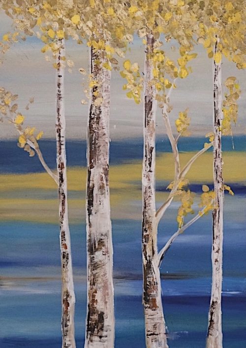 Two piece canvas set with birch trees and golden leaves abstract art. The ocean inspired background complements the golden leaves nicely. The golden leaves reflect light in a lit room
