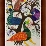 The painting depicts the intricacy of Indian folk arts namely, Gond. The intricate work of this painting is ideal to adorn any place in the house. It's beauty is enhanced by the especial technique of sgraffito to bring out the intricate designs on the animal figures