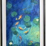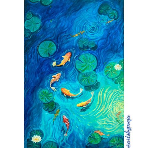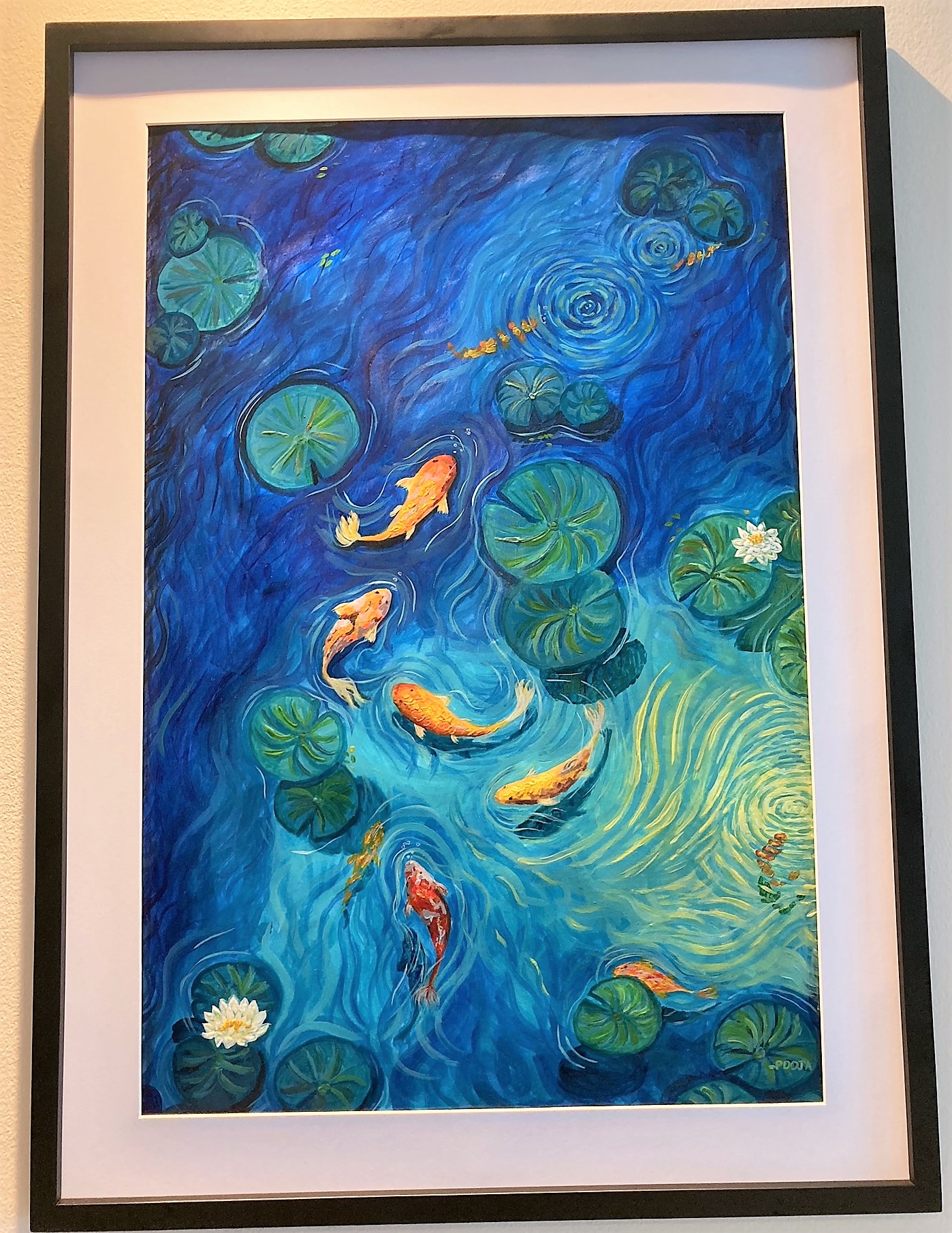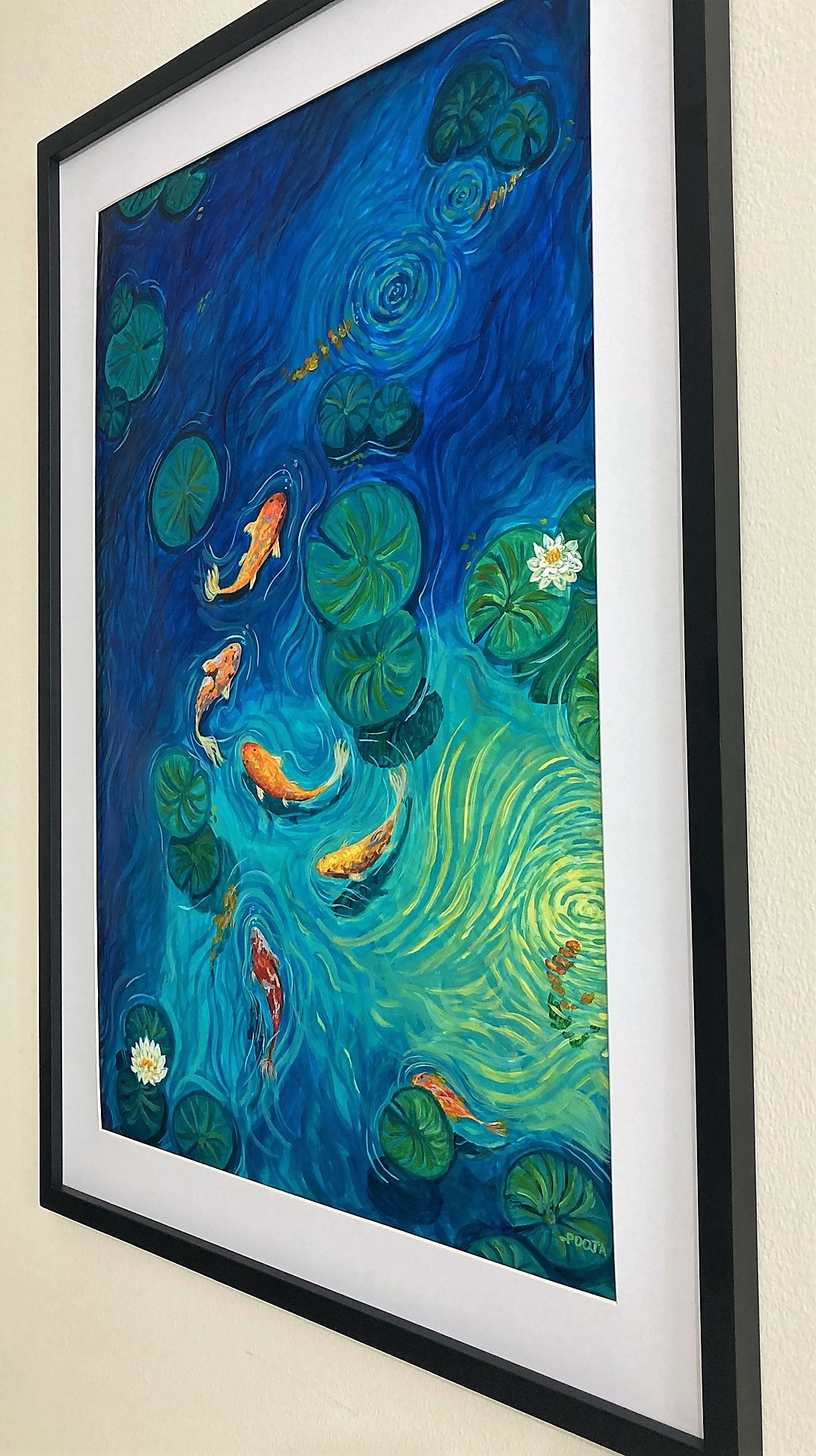 Koi fish are powerful symbols in feng shui for attracting abundance and prosperity. They are also very colorful and I wanted to capture their beauty in motion through the flowing water. The stream and the fish appear vibrantly alive and I hope this painting will bring warmth and joy! This is a handmade acrylic painting of 60 cms x 40 cms on 250 gsm paper. Frame of 50cm x70 cm is included. Colors on the painting might vary slightly from what you see due to screen color settings.
