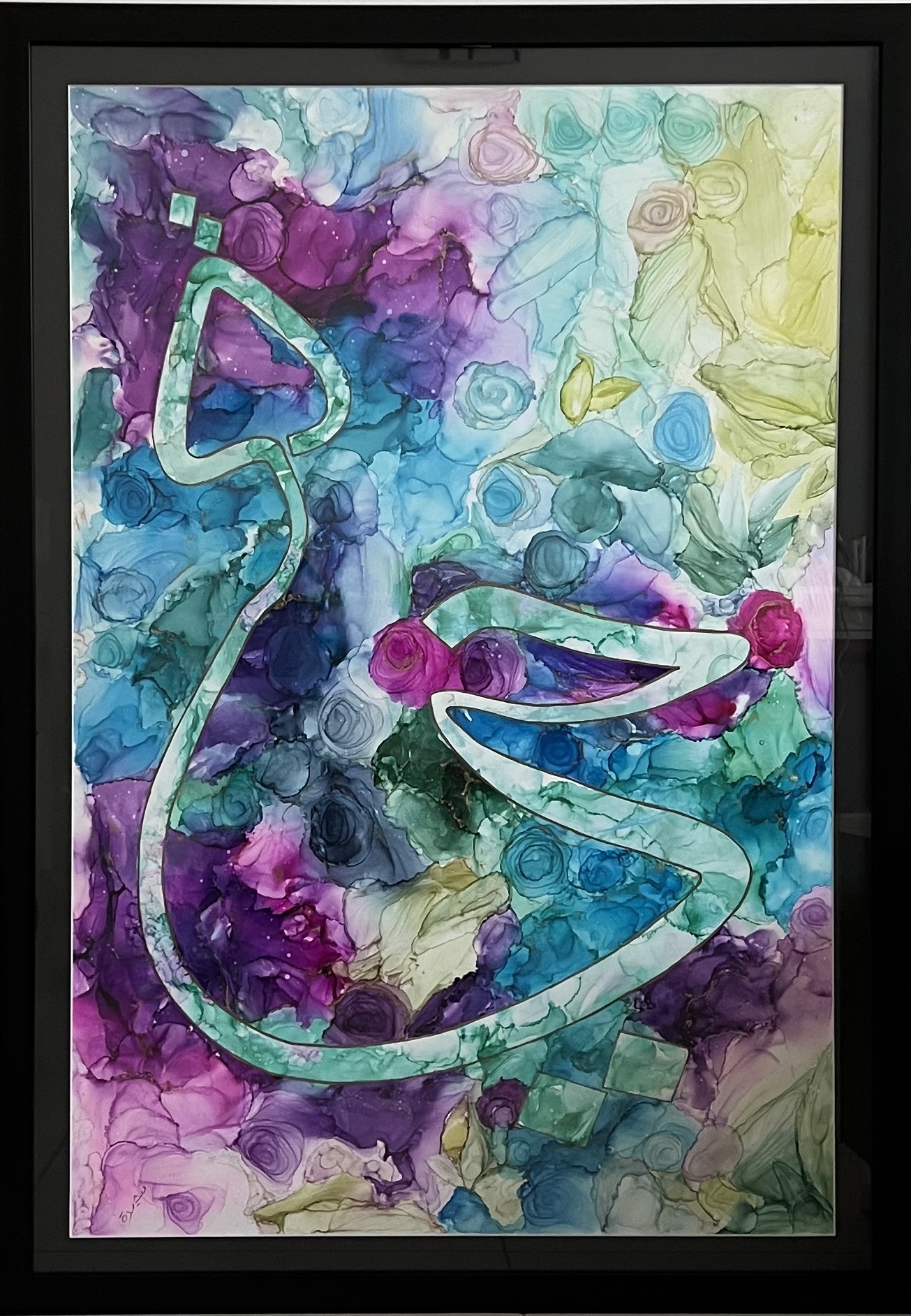 Hayat is a word so simple, so elegant, yet so rich in meaning. Hayat in its literal meaning represents life. It holds a great representation in our culture and Islam. It encourages followers of Allah to deflect anything that’s considered distasteful or abominable. It depicts the fusion of challenges and people that we come across in life and therein lies my depiction of this message in the myriad of colors fused together as the background of this art piece. It’s very close to my heart because it incorporates my 2 true identities, my art, and my religion. This piece is another one in my alcohol ink art series but with a twist of writing in it. The base includes alcohol ink flowers and leaves and has the bold and meaningful word HAYAT written in Arabic in the middle to signify how life is a bed of roses, life is a bouquet of flowers or life is like the leaves of a tree, that is, it encompasses a myriad of meanings and metaphors whose interpretation I like to leave up to the viewers of this piece!
