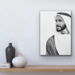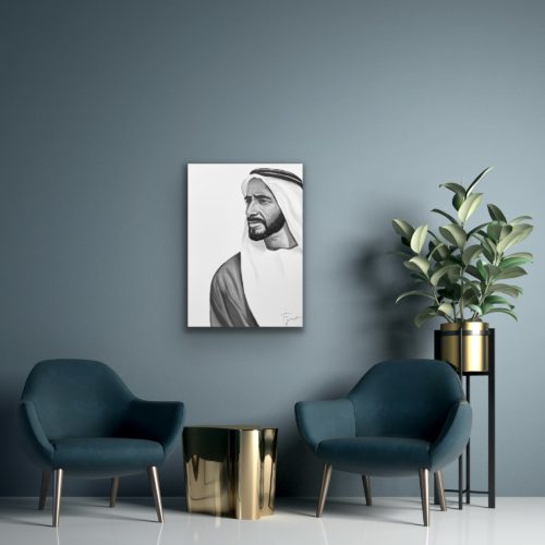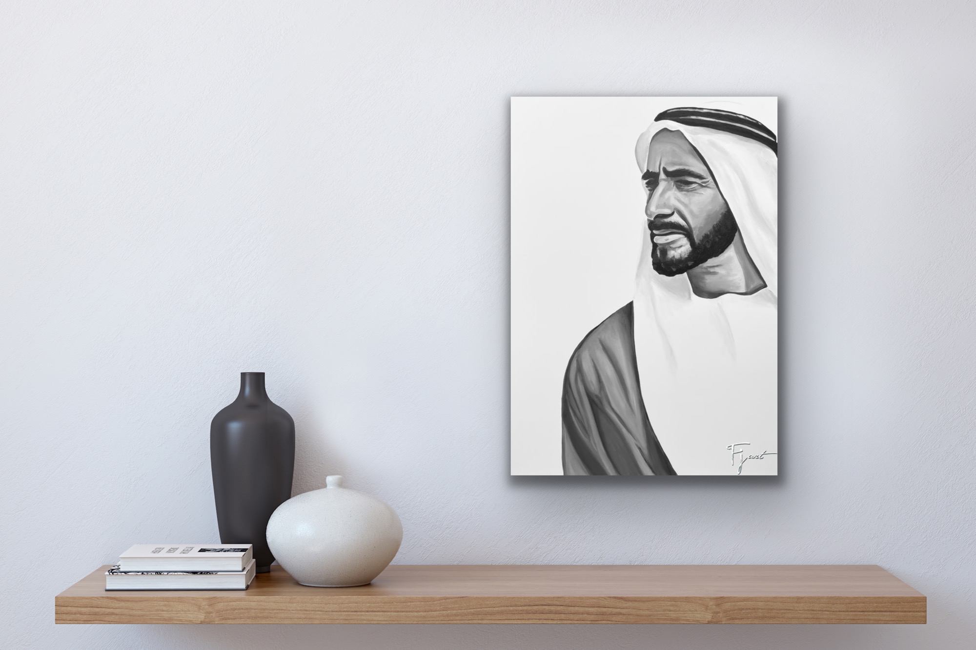 Portrait of the beloved Sheikh Zayed who was the founding father and het principal driving force behind the formation of the United Arab Emirates, uniting seven Emirates. The portrait is acrylic on canvas.