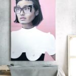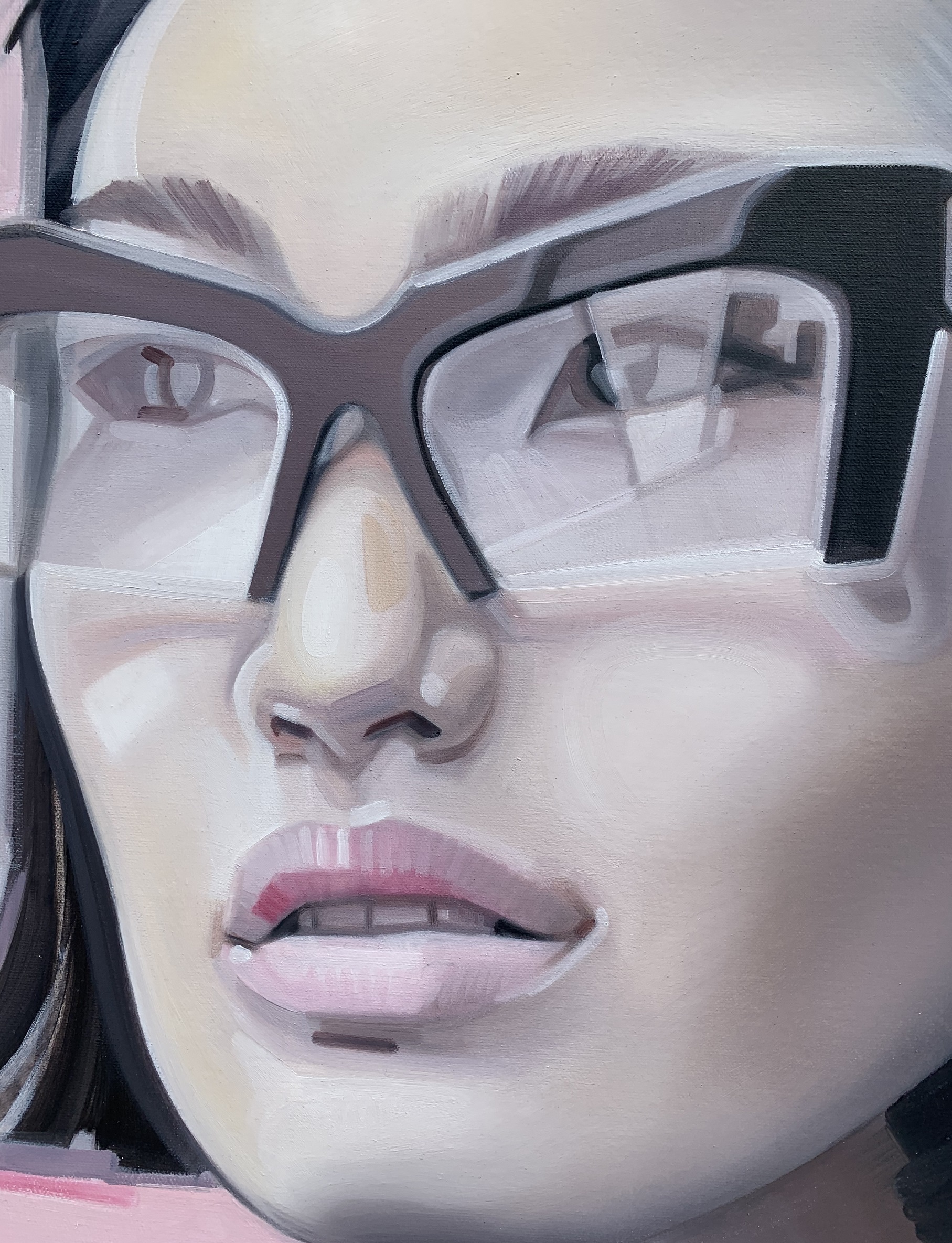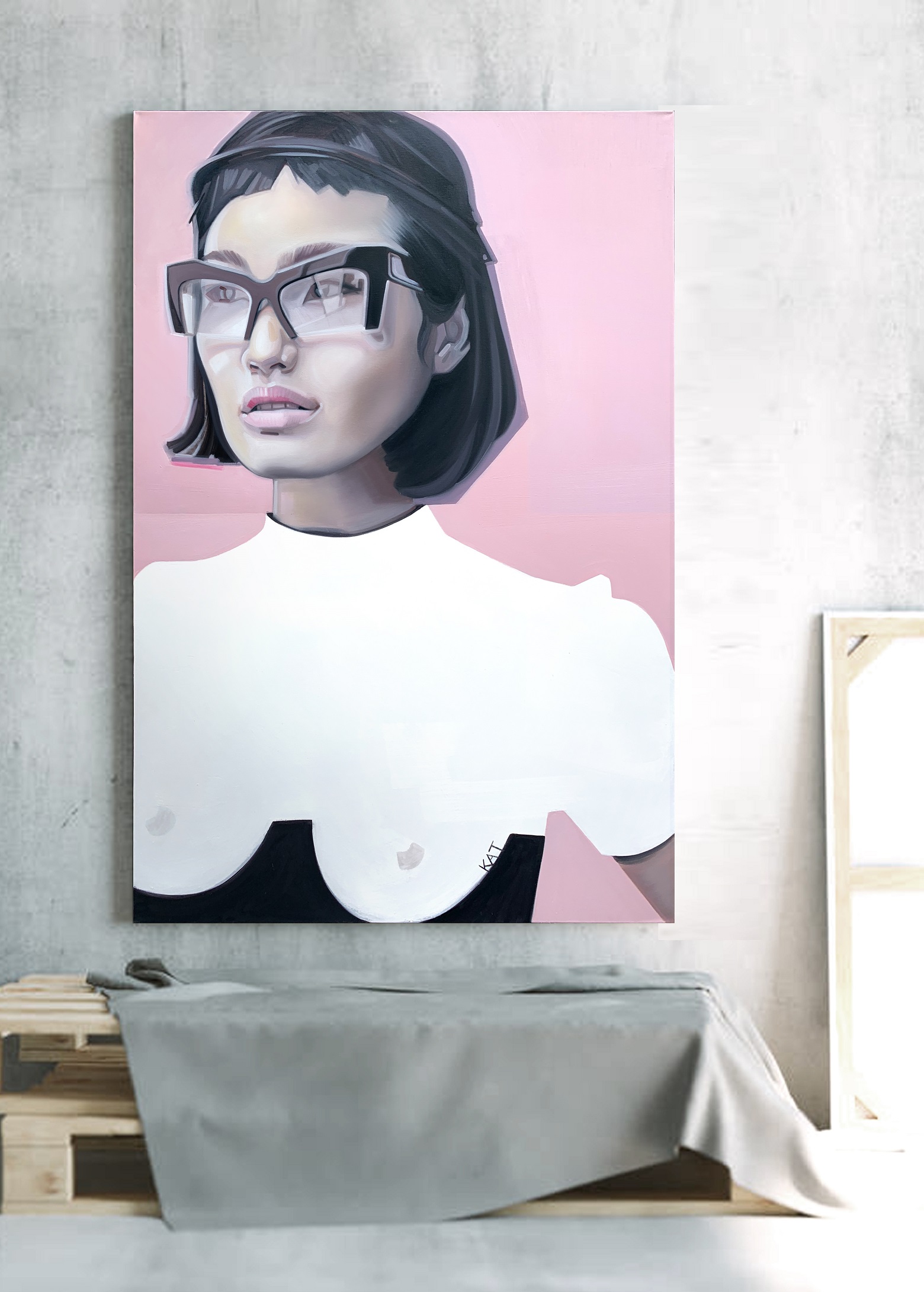 Painting: Oil, Acrylic on Canvas. Katalin Kristof in her large-scale portraits uses flat plains of colour to disrupt the sculpturesque shapes of the figures or to tell a narrative of a dreamlike architectural landscapes. In her works she is contrasting the abstraction of both form and colour with the - sometimes photorealistic - details of her models face or gestures. Her iconic colours of flat acrylic paint spread and create and infinite space in the background making the oil-painted realistic details of the figure to stand out from the canvas. Her figures are often drawn from images found in fashion magazines - usually mixtures of faces, clothes, bodies of different models-, repressed and concealed by thick layer of painted geometric shapes.