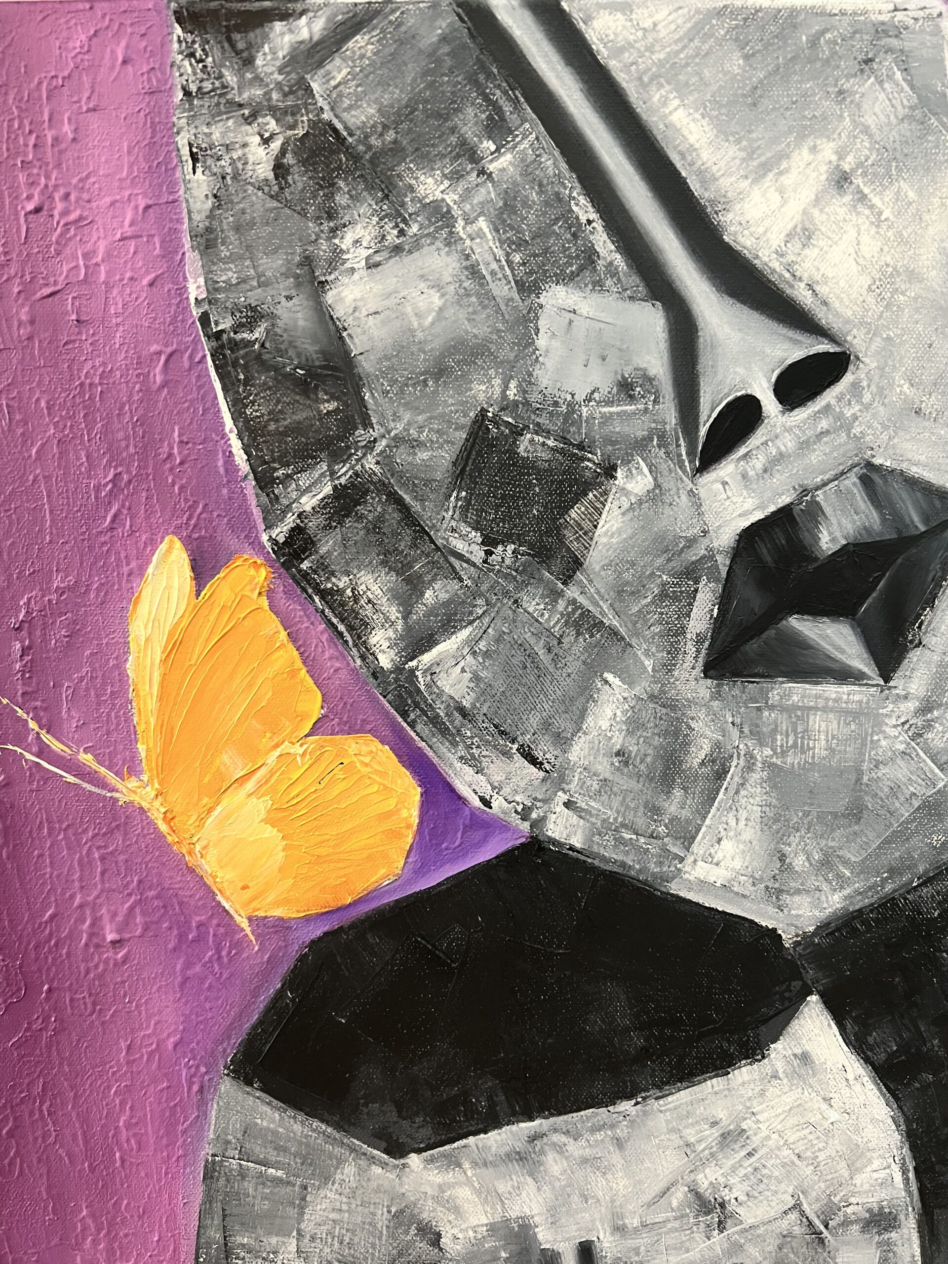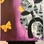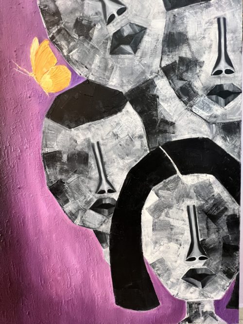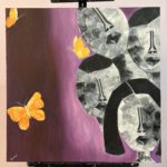 Butterflies, universally seen as a symbol of the fervent representation of life and incorporeal rebirth. They’re seen as a ray of hope and transformation. This is the newest painting of my ‘Faces’ series, and it only seemed best to pair it with these tranquil winged creatures. My deep-rooted message behind the imperfectly perfect faces is to break the barrier of the high beauty standards where a certain look is considered as an epitome of perfection. Whereas in reality, we are all perfectly imperfect, constantly changing and growing. That’s where the butterflies play a role in the message of this artwork. They signify the growth and spiritual reforms we go through as human beings living amongst the endless faces, the endless standards, and the endless barriers. The ombre of dark purple and mauve for the background acts as a bold representation of the independence everyone has to be their own unique person, different from any other, while purple acts as a messenger of grandeur, independence, and creativity. The bright yellow-orange of the butterflies simply binds together the whole painting as a serene sight giving a surge of happiness!