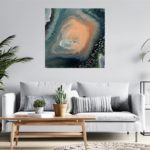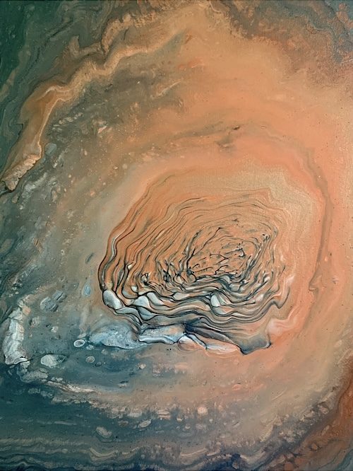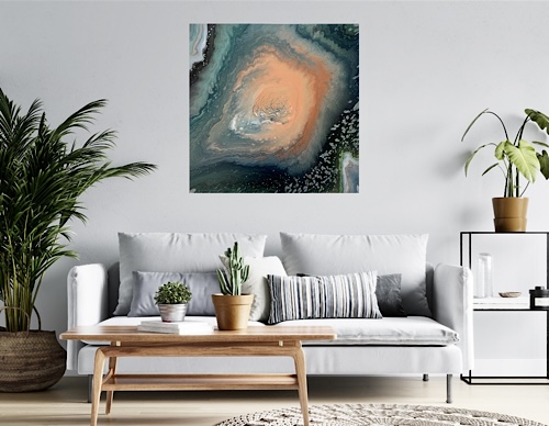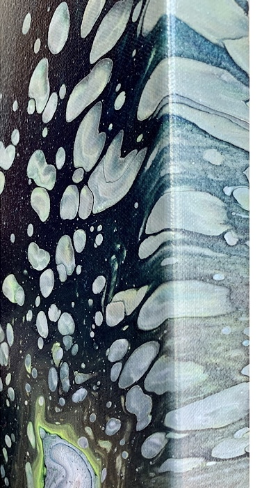 An original high quality acrylic painting on a gallery wrapped canvas with cold, warm, metallic and shimmery colors. It has a beautiful sheen and finished with a gloss varnish. It is one of a kind and ready to hang with no need for framing as the edges are painted. This artwork is inspired by the wonderful outer space, its calmness and immense energy. Something in our human souls makes us cling to it, we try to explore it, sail with our imaginations and even our dreams on eternal journeys in this endless world of secrets. This world pushes us to meditate and delve deeper not only into this vagueness, but also for the nature of the human soul and the inner power it contains.
