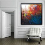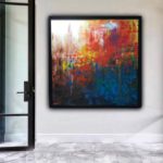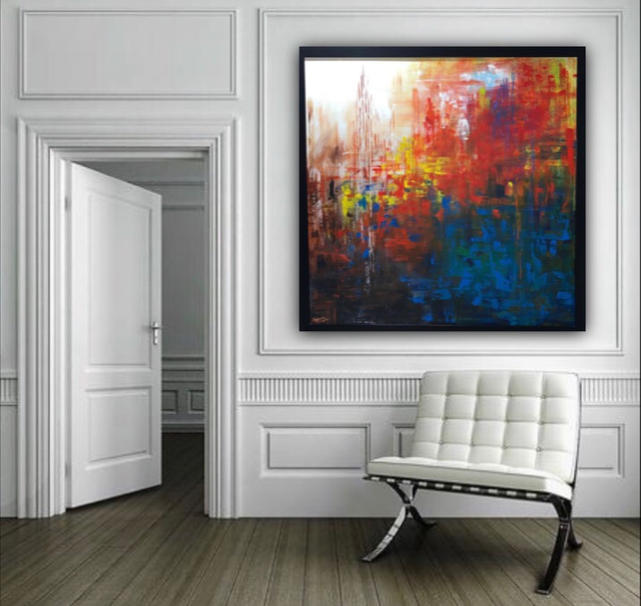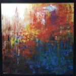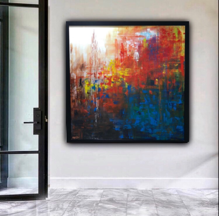 INTERWOVEN Framed( plain black) Size 106/106 cm with frame Acrylic on linen By artist Sharmila Tulpule Depicting of interplay of five elements of nature- fire, water, air, earth and ether!