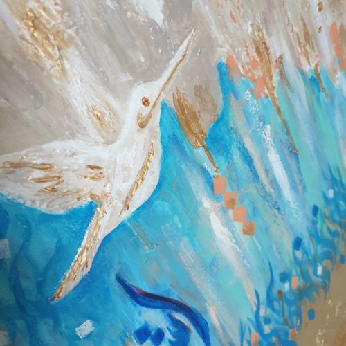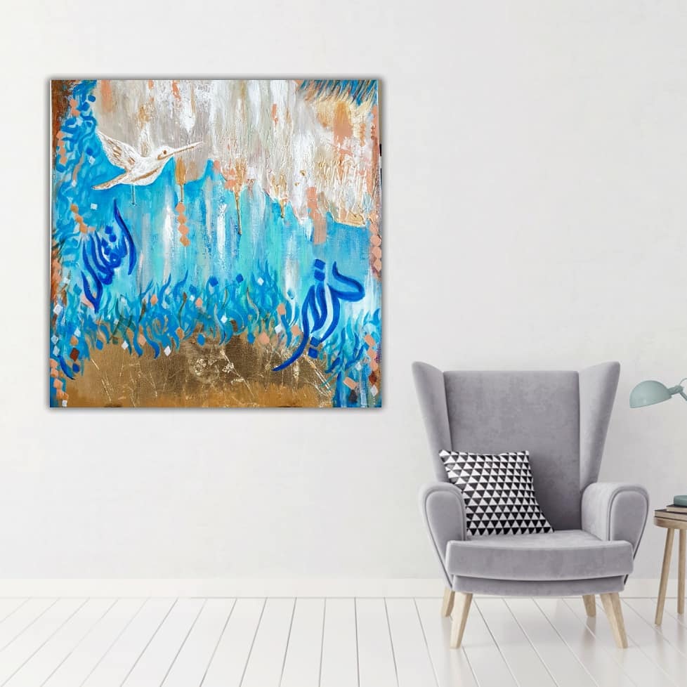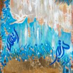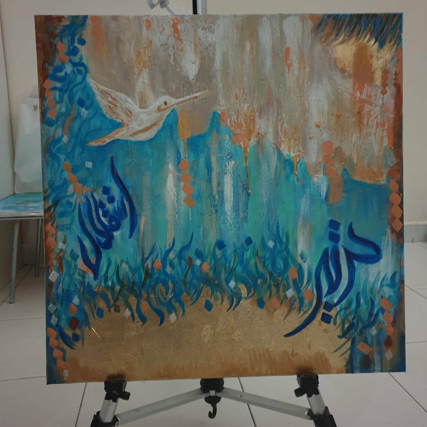ISTIQLAL means freedom. Acrylic paints used with lots of texture to give depth to the painting. Gold leaf detailing.