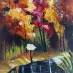 Oil paints are used but the strokes for trees, leaves, umbrella are given by knife. To finish the painting knife is used to highlight it.