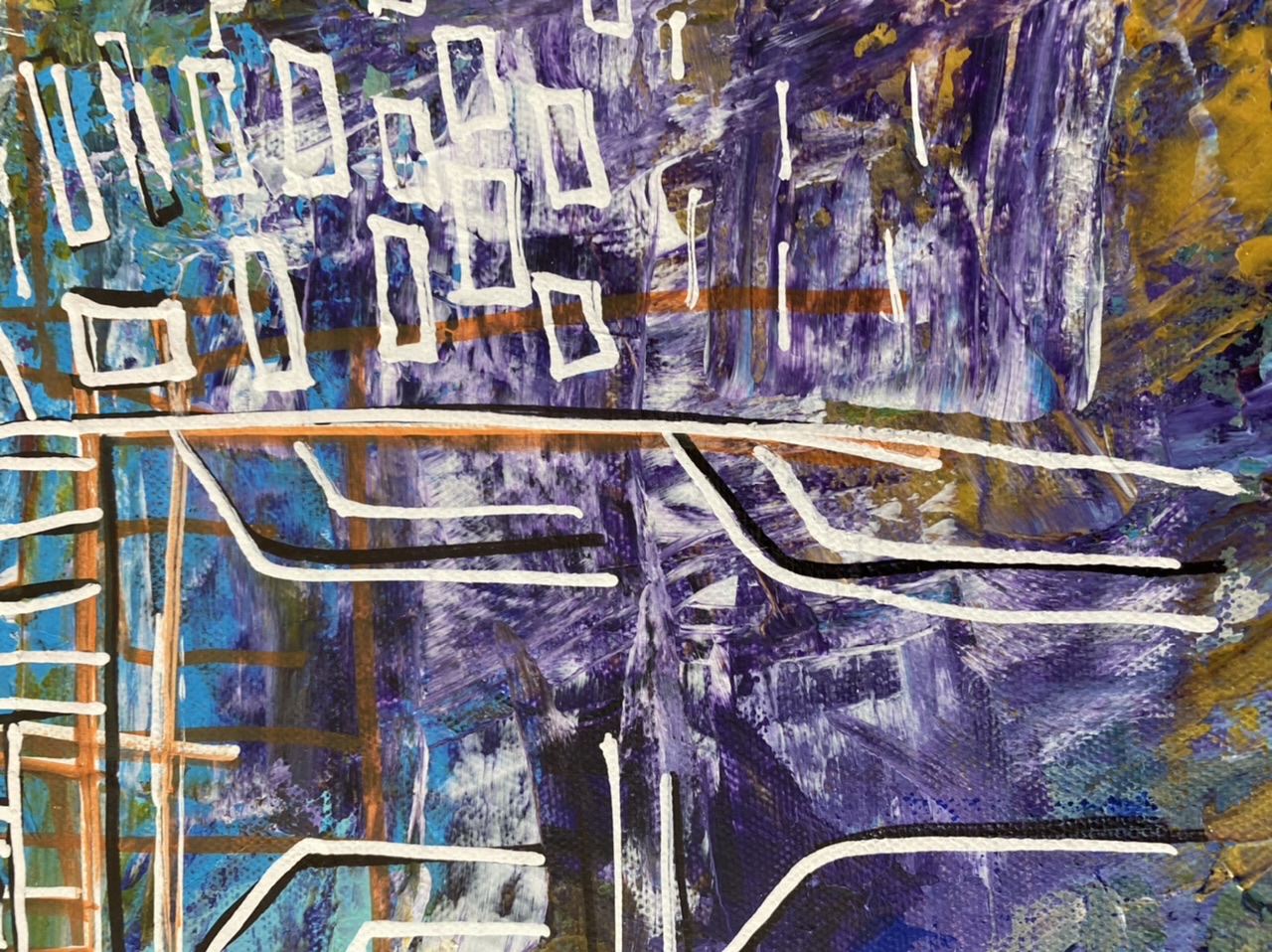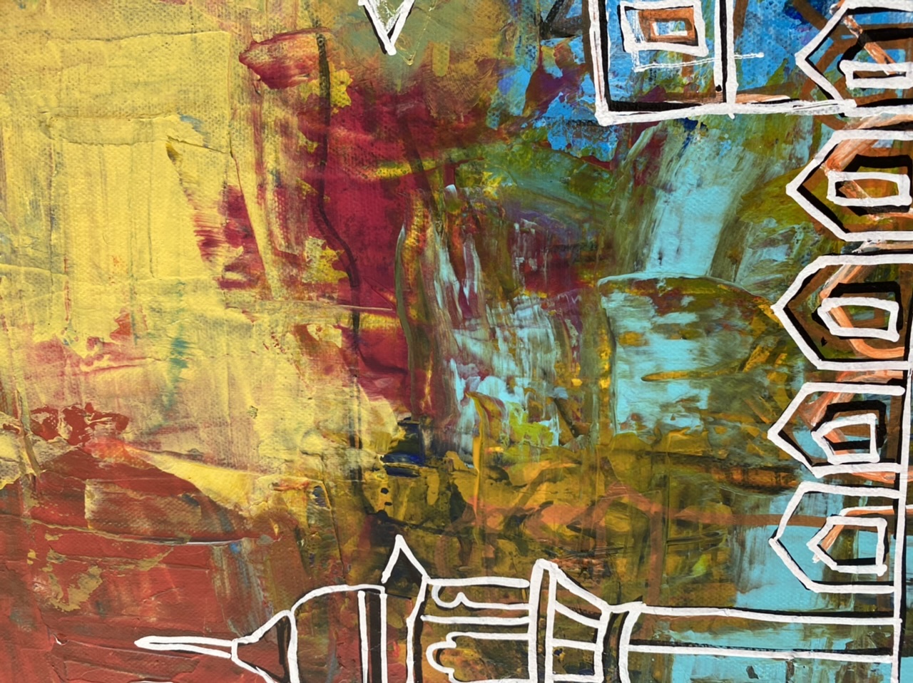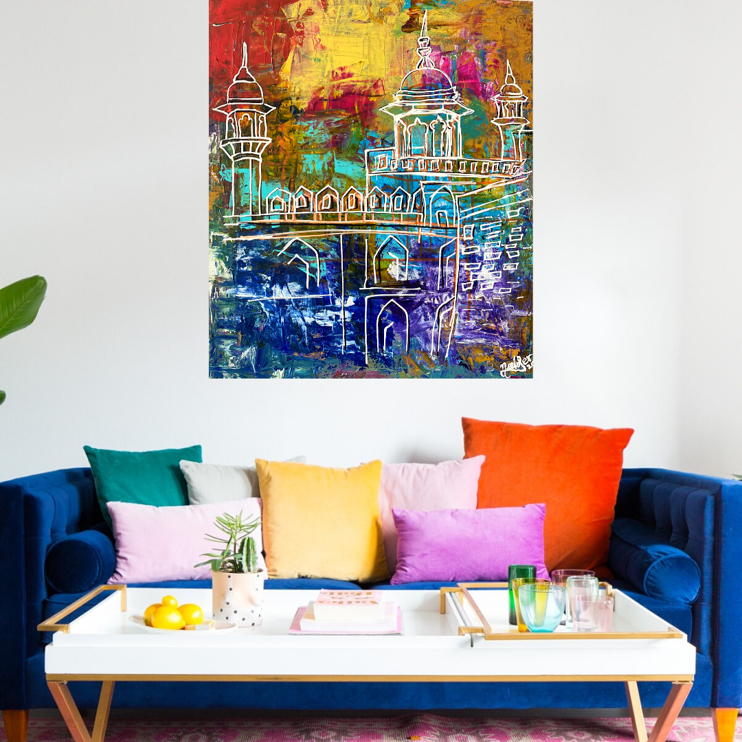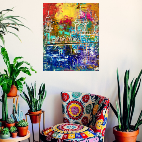 Lahore Fort شاہی قلعہ‎ Shahi Qila, or "Royal Fort" is a citadel in the city of Lahore, Punjab, Pakistan. It contains 21 notable monuments, some of which date to the era of Emperor Akbar. An abstract depiction of the fort, showcasing a textural background with palette knife and vibrant hues with mixed mediums.