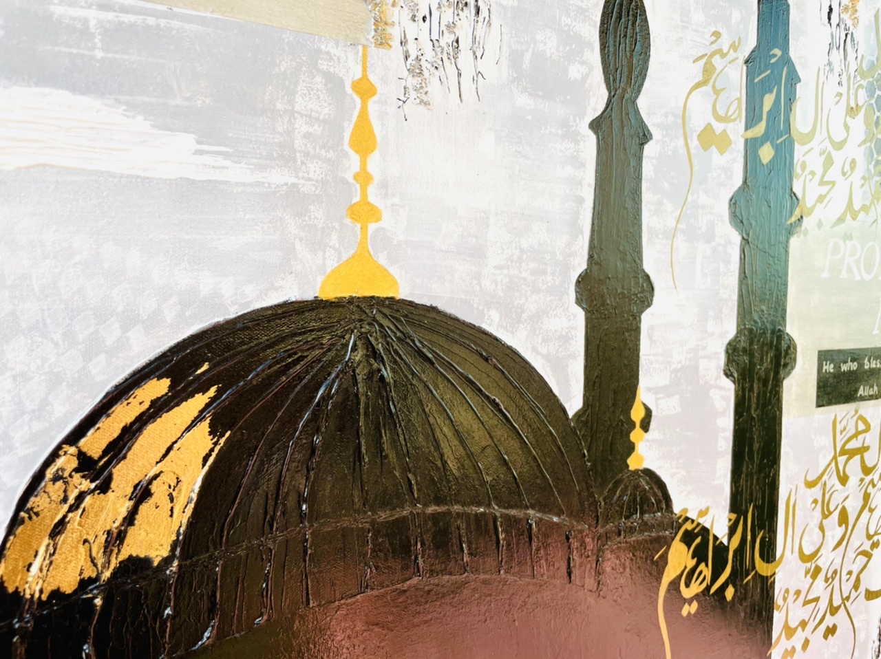 Acrylic on canvas Islamic art Masjid e Nabwi (prophet’s mosque) Wordings- “Durood shareef” Abu huraira reported: The messenger of Allah said “ he who blesses me once, Allah would bless him ten times “ Script- Diwani” Painting is silver framed Painting is silver framed.