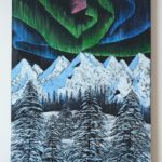 Northern lights or the Aurora Borealis is a formation of colourful curtains of light in the sky which i have achieved using green, blue and crimson. The mountains filled with snow are achieved with palette knife. The snow all over is given a hint of beautiful bluish colour as reflection of the night sky lights.