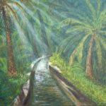 This painting was inspired by the beautiful Al Ain Oasis. It brings home the serene atmospheric feeling of a green oasis amidst the desert land. The water in the Falaj calms and takes us to a meditative stage.