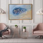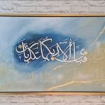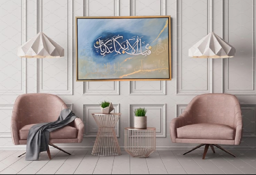 Surah Rahman, verse 13, painted in ocean blue hues with the touch of gold leaf.