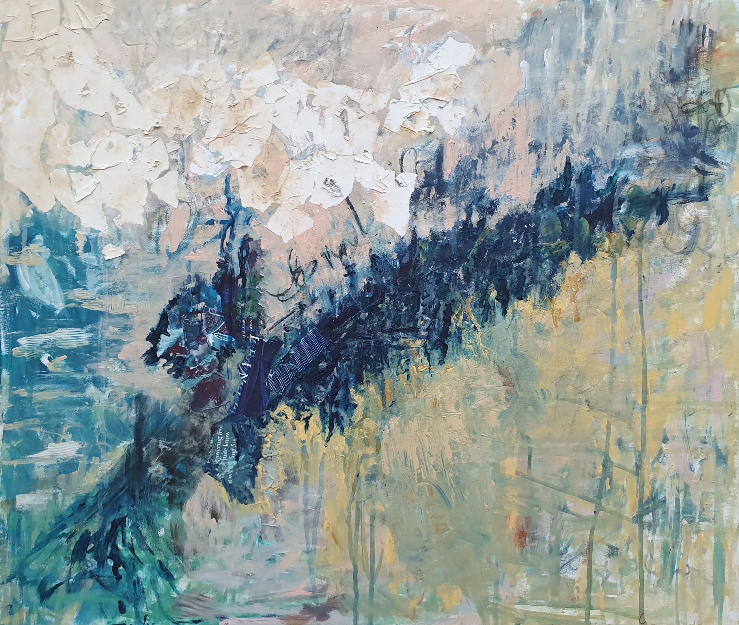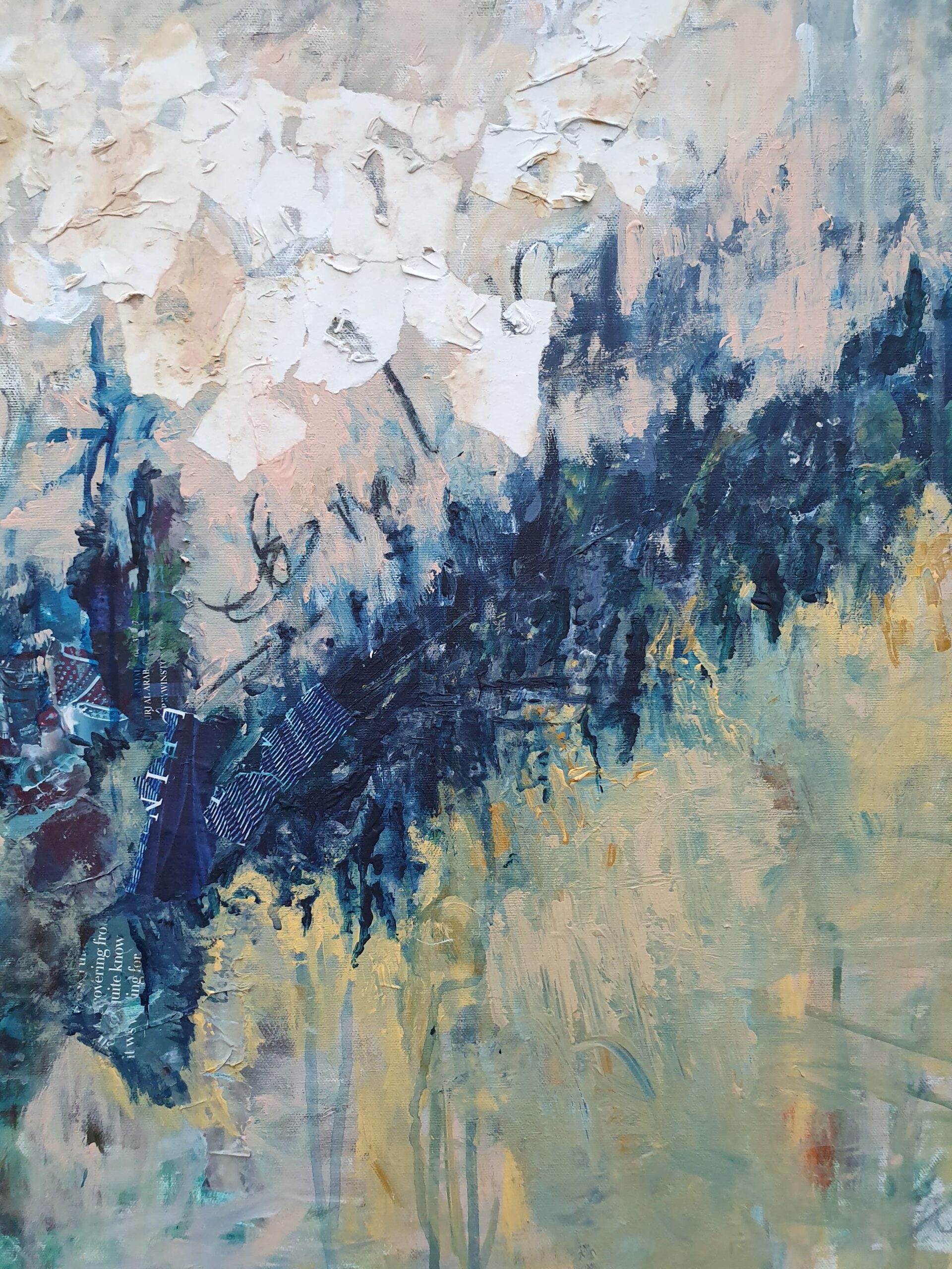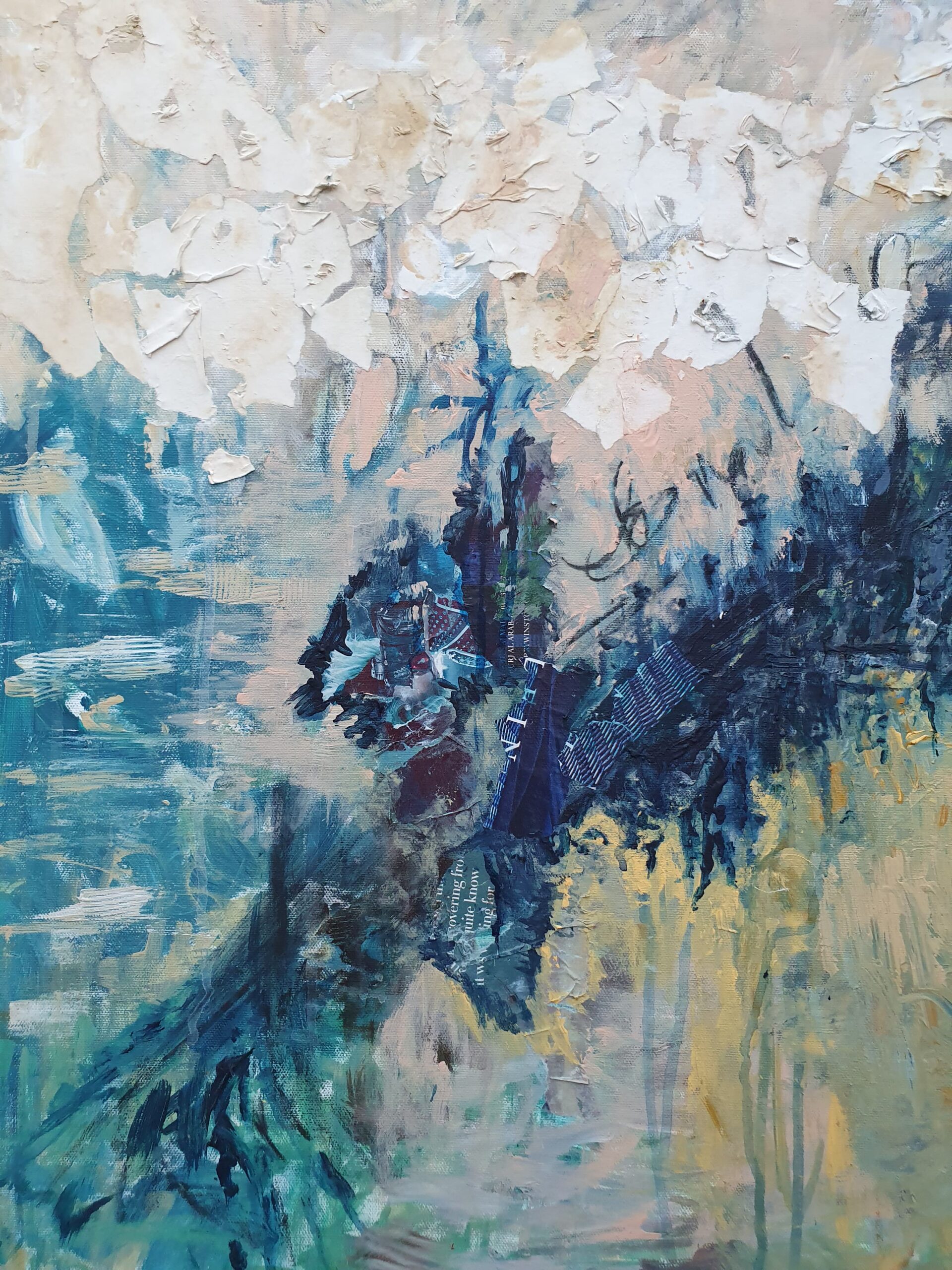 Titled: On the other side of the shore Mixed media (collage, ink and acrylic) on canvas