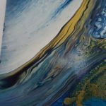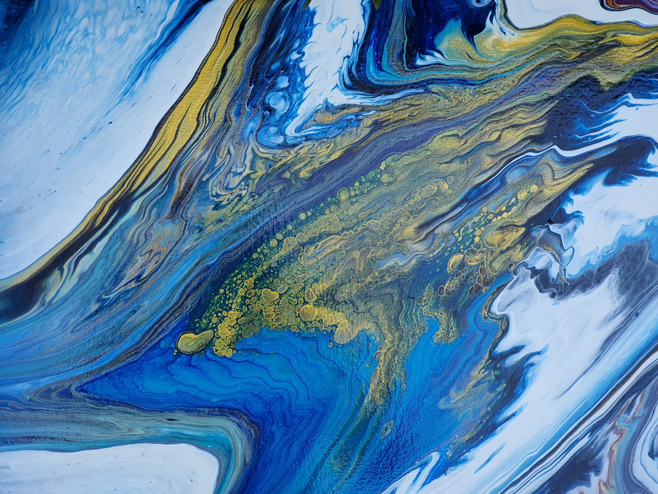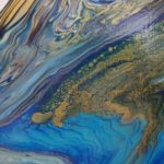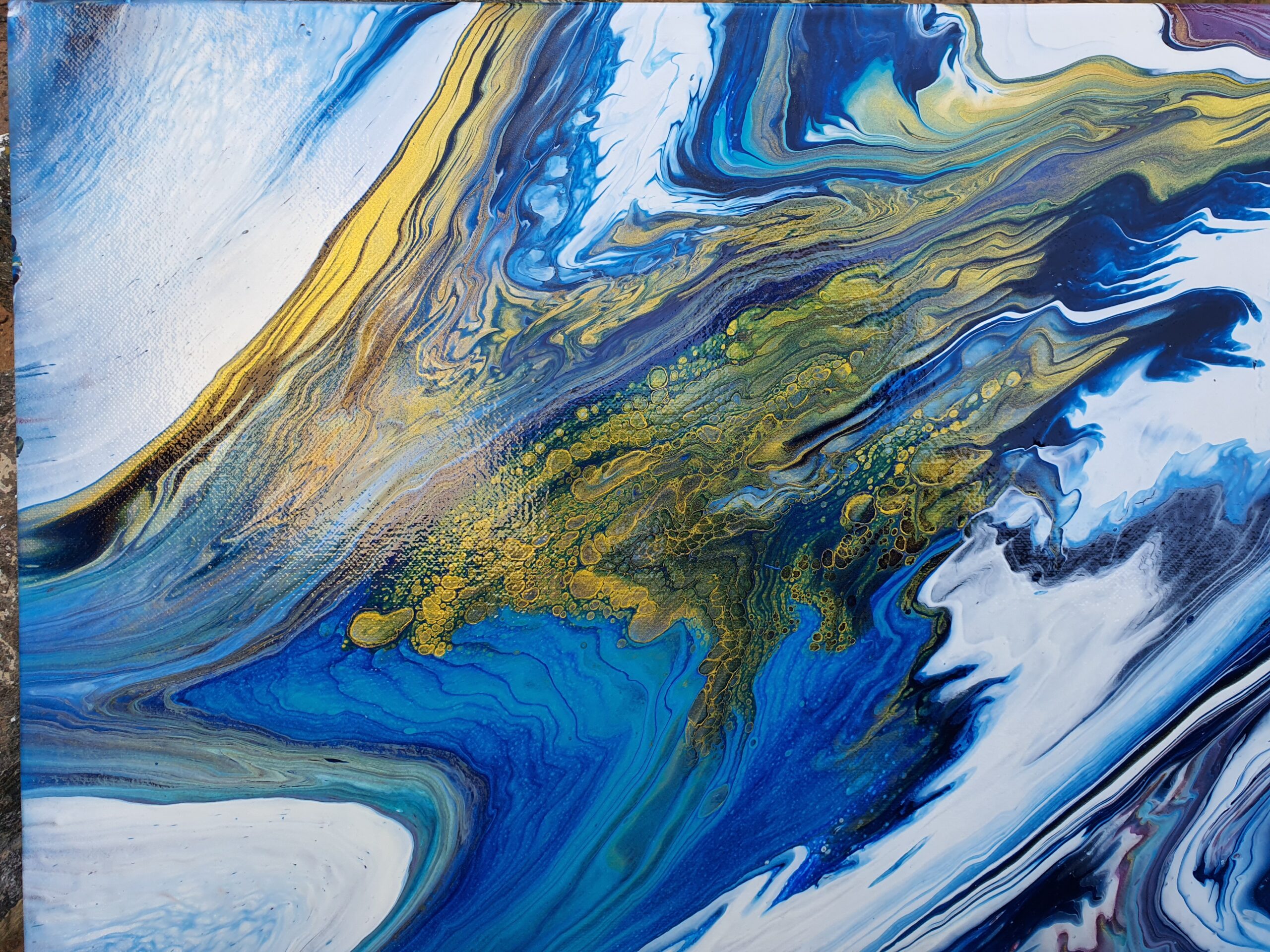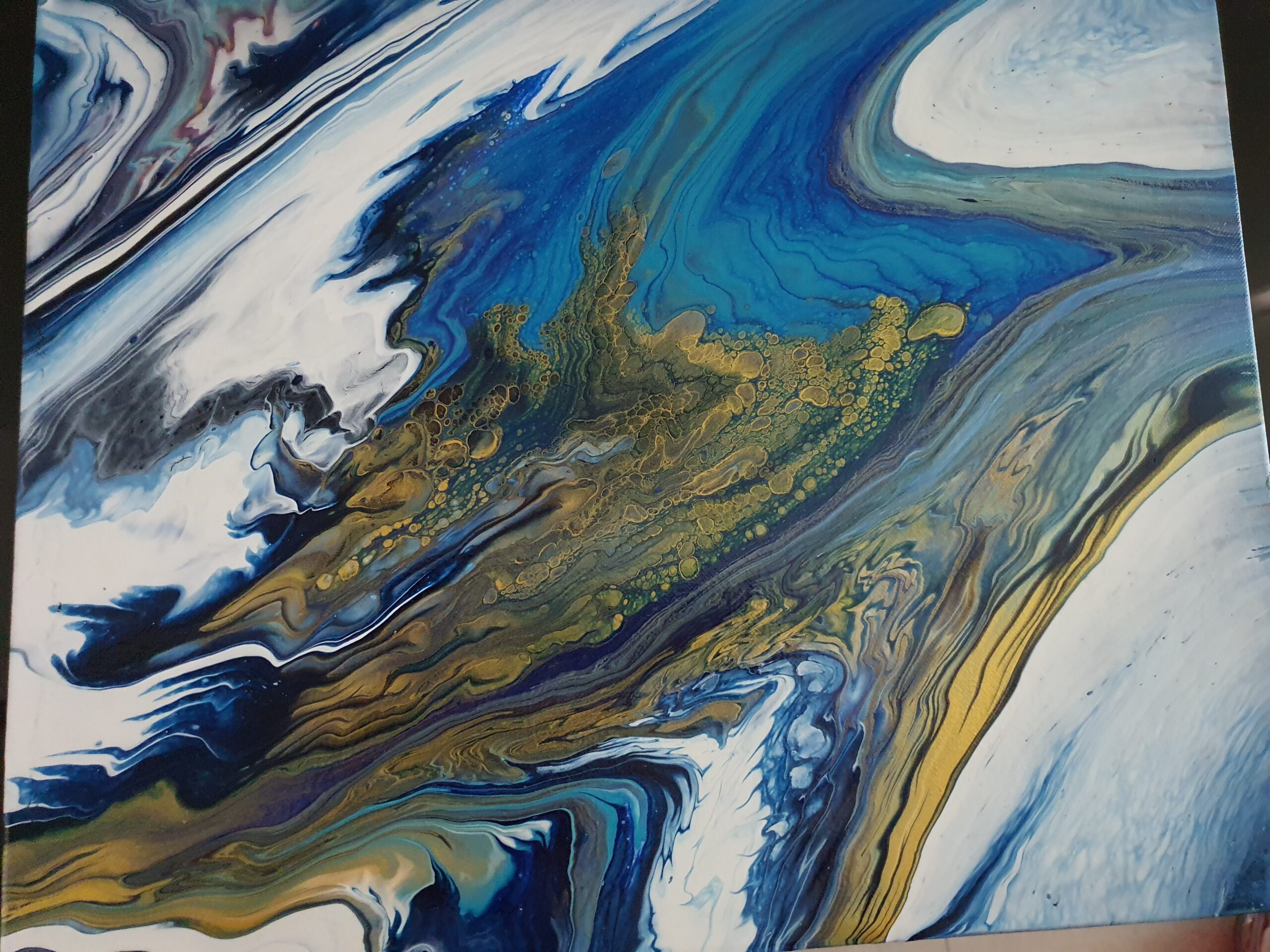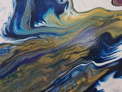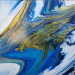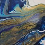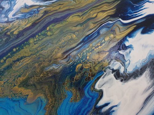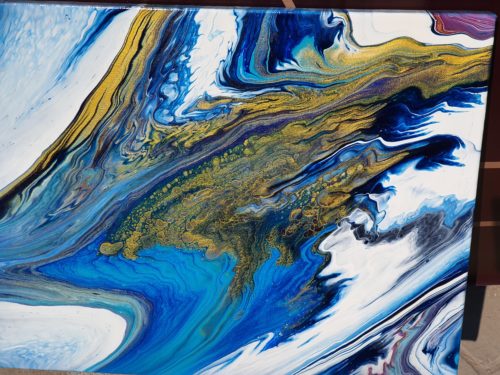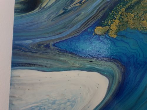 "Opulence" is a fluid acrylic pour painting. It is an original Painting on a 14 x 18 x 1 inches (35 x 45 x 2.5 cm) stretched canvas. The painting is a beautiful and rich combination of intense and calming colours of bright turquoise, darker shades of blue, dazzling gold and a hint of magenta. This unique artwork is intense and lavish in colour and contrasts and is about subtle beauty and energy. "Opulence" with the shimmering and effervescent gold evokes beauty and energy with blowing wind and lush currents and depths. A quality painting with the edges painted. It does not need to be framed before displaying. The painting has been varnished and can be displayed as one sees fit.