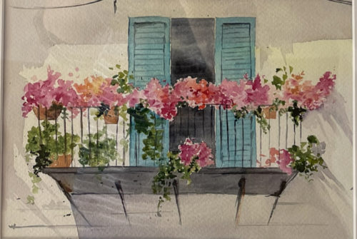 Framed hand painter watercolor pink flower aroung beautiful balkony