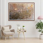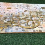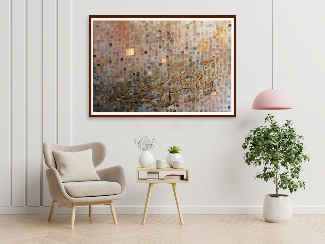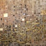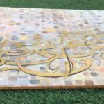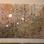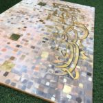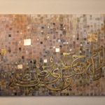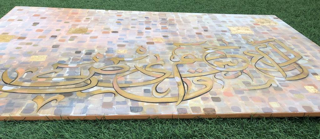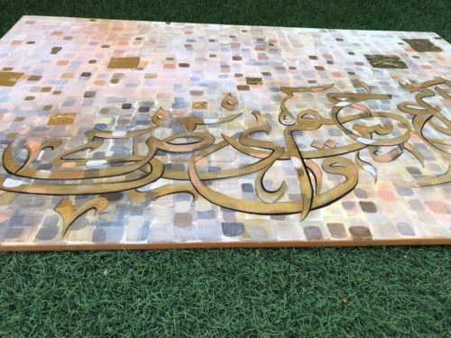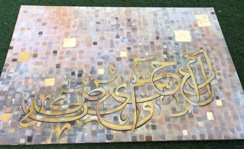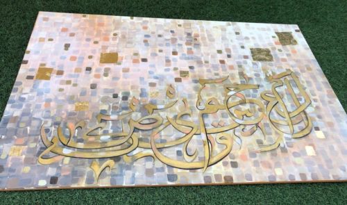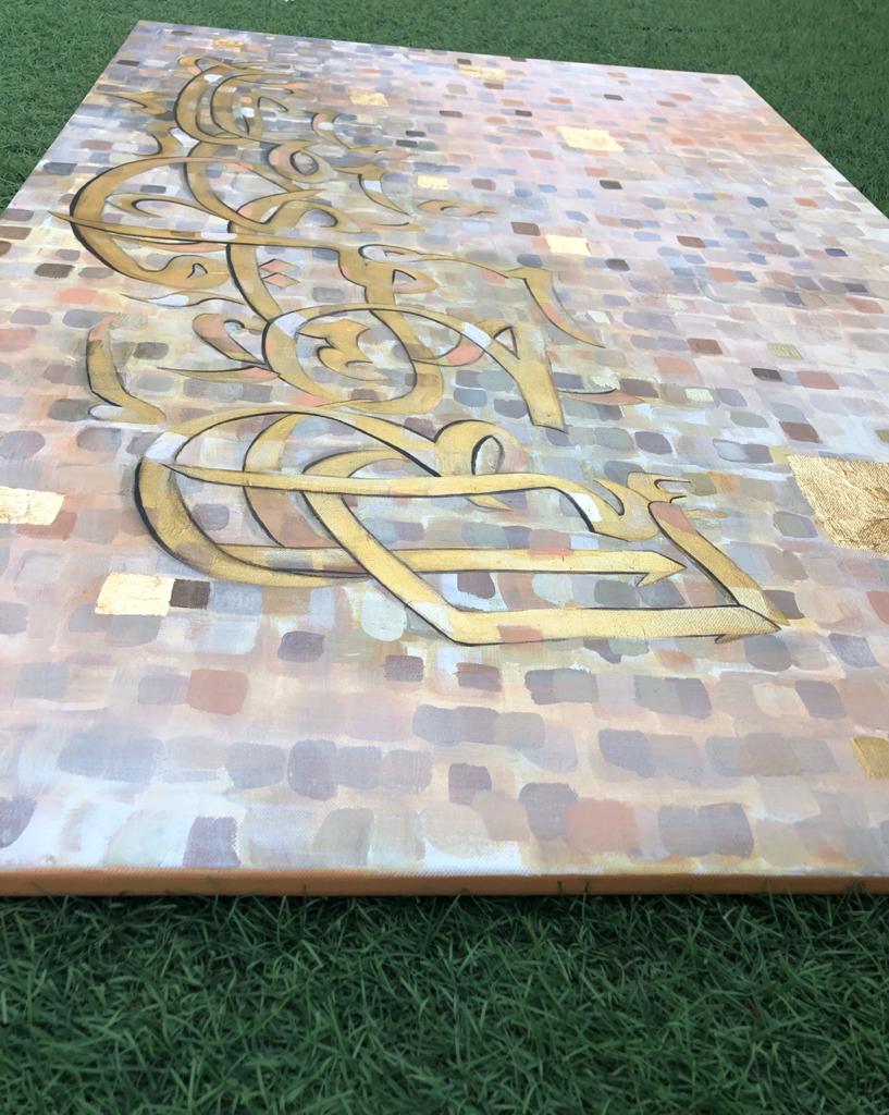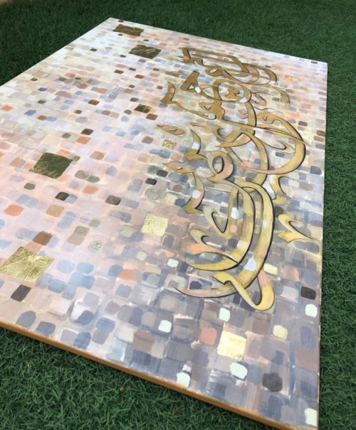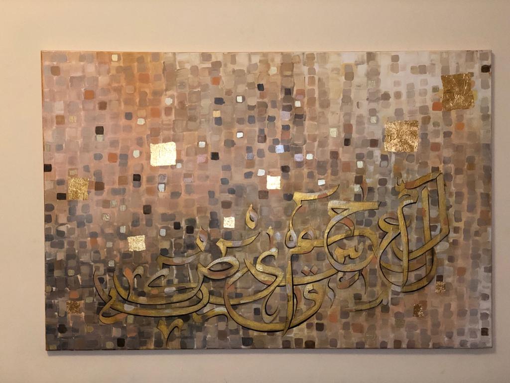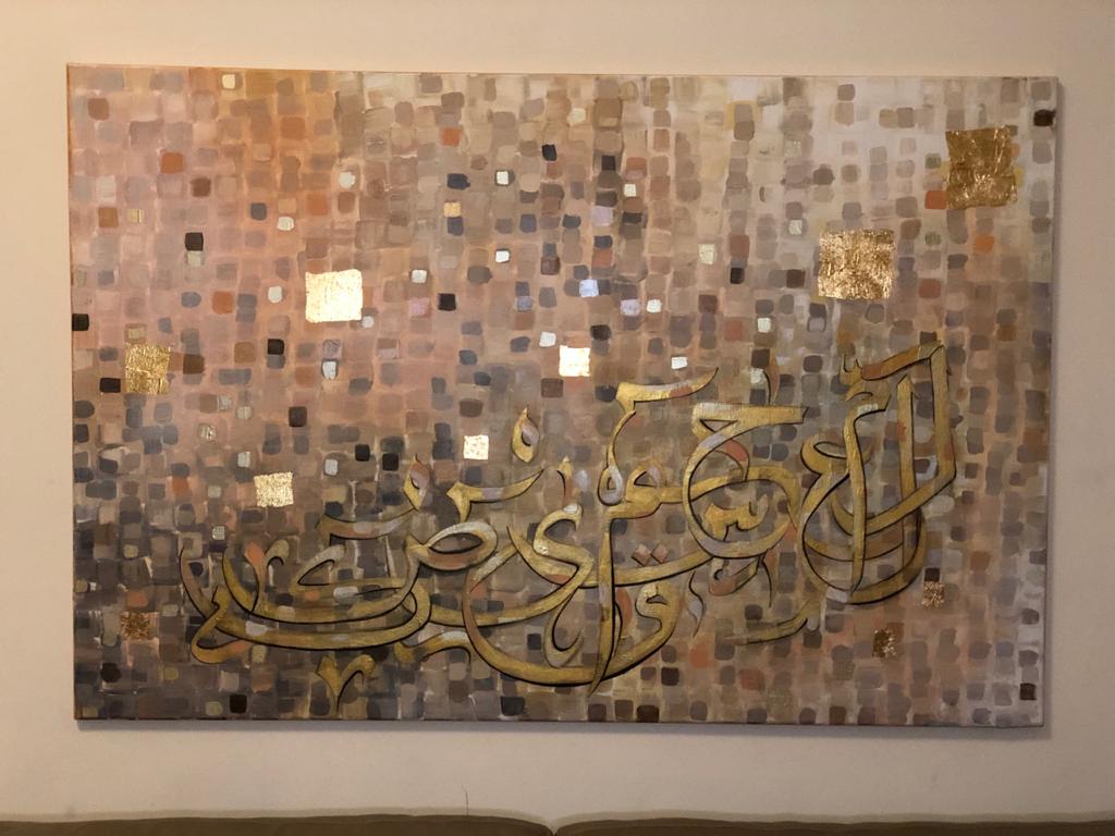 A gorgeous piece in neutral colors with lots of layers of paint....one shade of color showing from under the other creating some pretty overlapping shades..... Beautiful calligraphic letters of the Holy Quran in shades of gold with a few pixels popping up here and there....