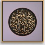 "رَبَّنَا هَبْ لَنَا مِنْ أَزْوَاجِنَا وَذُرِّيَّاتِنَا قُرَّةَ أَعْيُنٍ وَاجْعَلْنَا لِلْمُتَّقِينَ إِمَامً Our Lord! Grant unto us wives and offspring who will be the comfort of our eyes, and give us (the grace) to lead the righteous. Surah Al Furqan, verse 74 Mixed media painting Chalk paint, gold leaf and acrylic paint. 80cm × 80cm