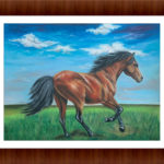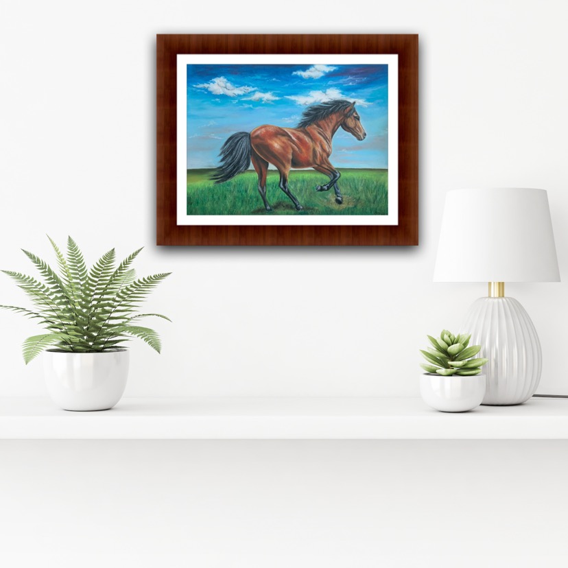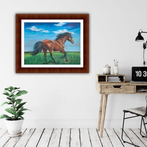 The running horse is a crucial part of Vastu Shastra. The painting of running horses can balance energy in your house. Running horse signifies success and power. A horse represents endurance, speed and courage The best direction to place this Horse is the South corner of a room or office to get mobility, bring you the desired fame, respect, and popularity. Place this beautiful horse on your desk for better luck in wealth and good fortune. To add to the beauty of this amazing creature, I wanted to compliment it’s beauty with the beauty of different shades of blue in the sky and some clouds. As the horse is running freely in a grassland, the ground has been developed with different shades of greens ro bring out the meadow effect.This beautiful creature has been created with oil pastels. The eyes and other detailed areas are done using pastel pencils. It’s made on the canson Mi Teintes pastel paper which has the canvas paper feel and look to it. It’s a high-grade paper which is very durable and strong. The size of the painting is 65 by 50 cms without frame.