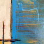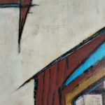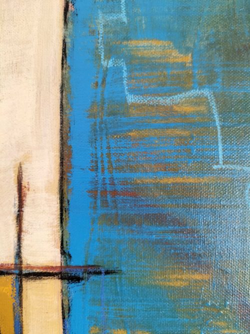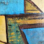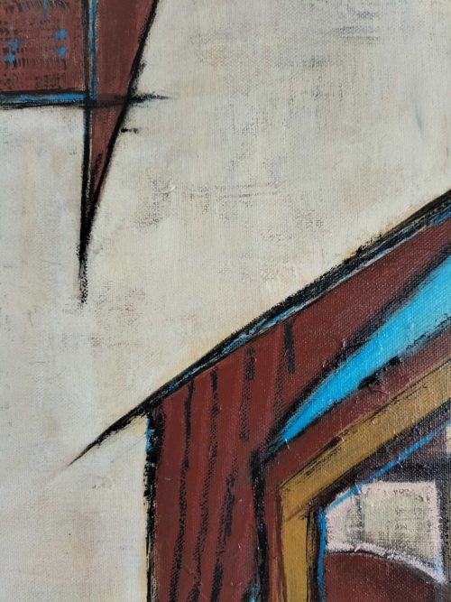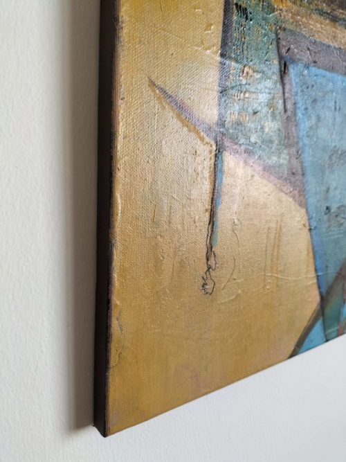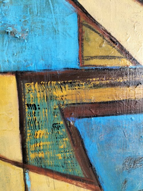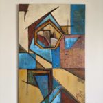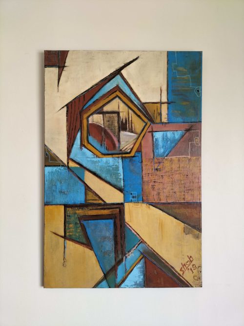 It's an unframed acrylic mixed media painting on stretched canvas. With bold colours and geometric cubist shapes it can be hanged vertically or horizontally depending on the overall look of the interior space.