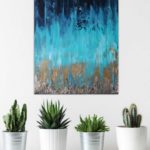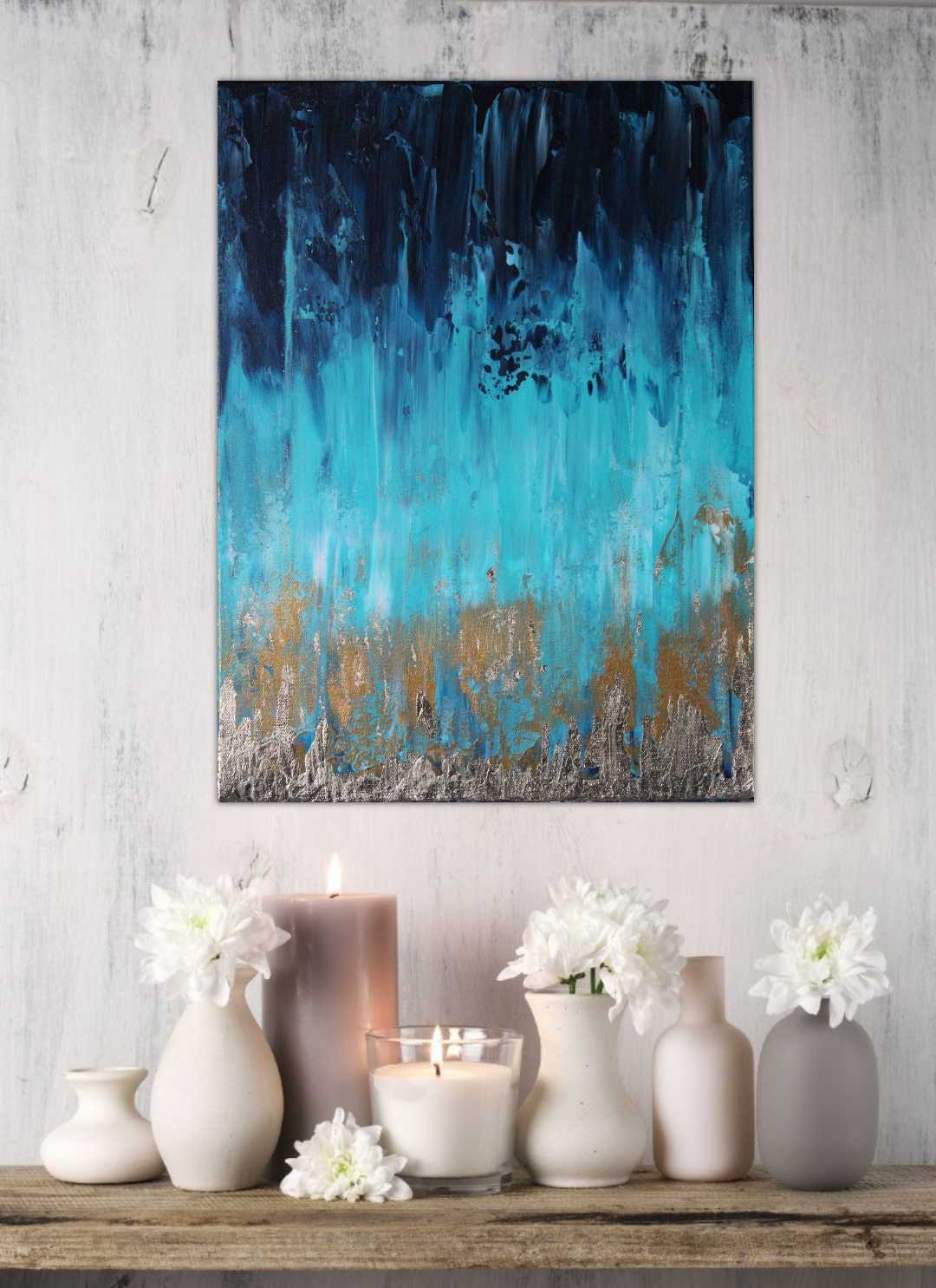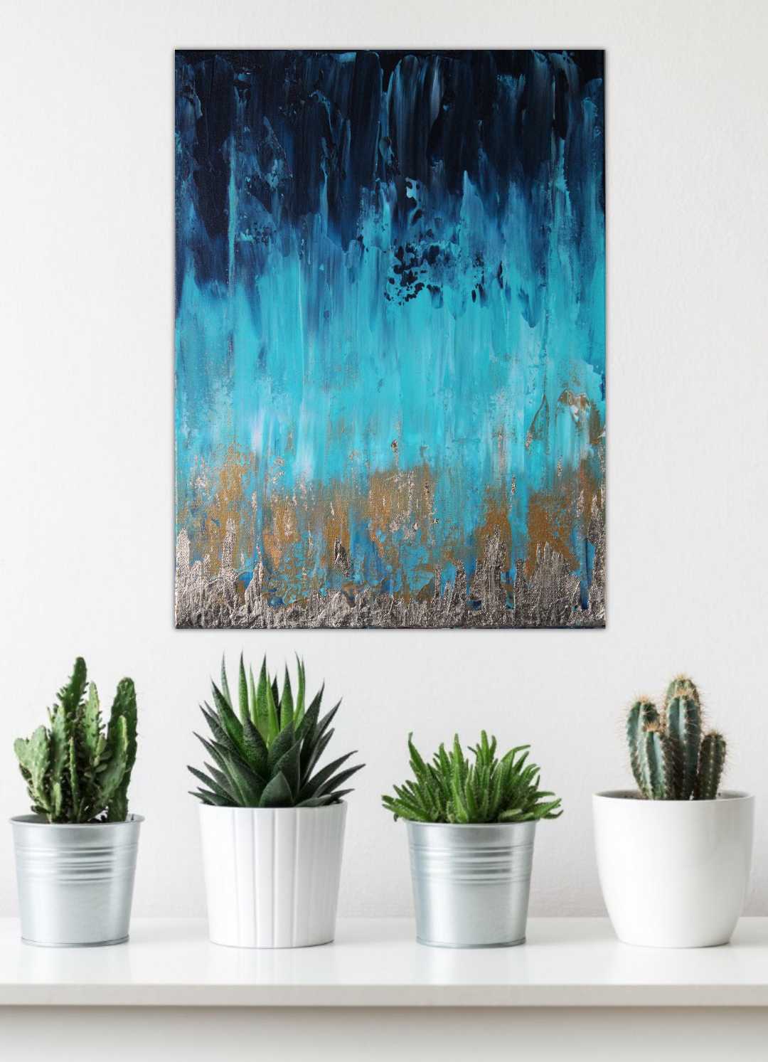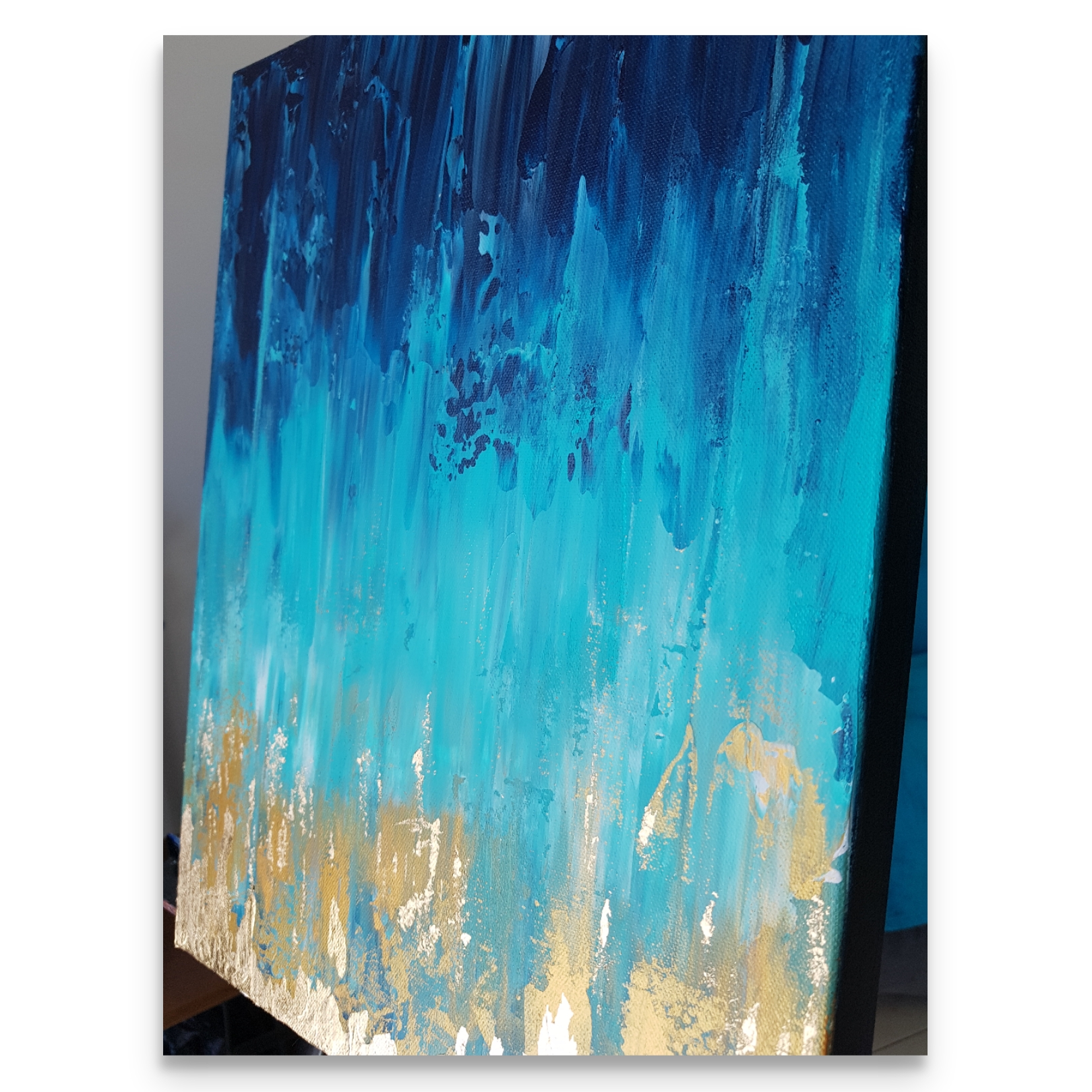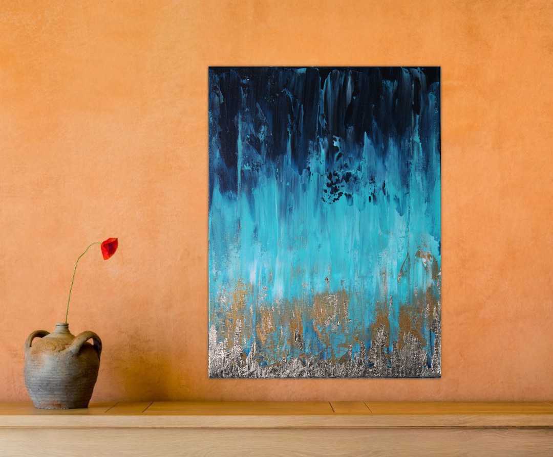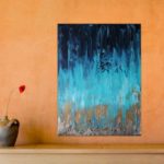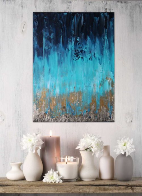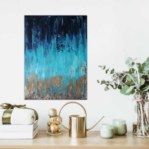 Original, abstract, acrylic and metal leaf painting made on a deep edge stretched canvas in 2020. This piece is painted on the sides as well and it does not require a frame. It is fitted with a wall hook and is ready for hanging on your wall. Original artwork signed and dated on the back by the artist. Certificate of authenticity provided by the artist.